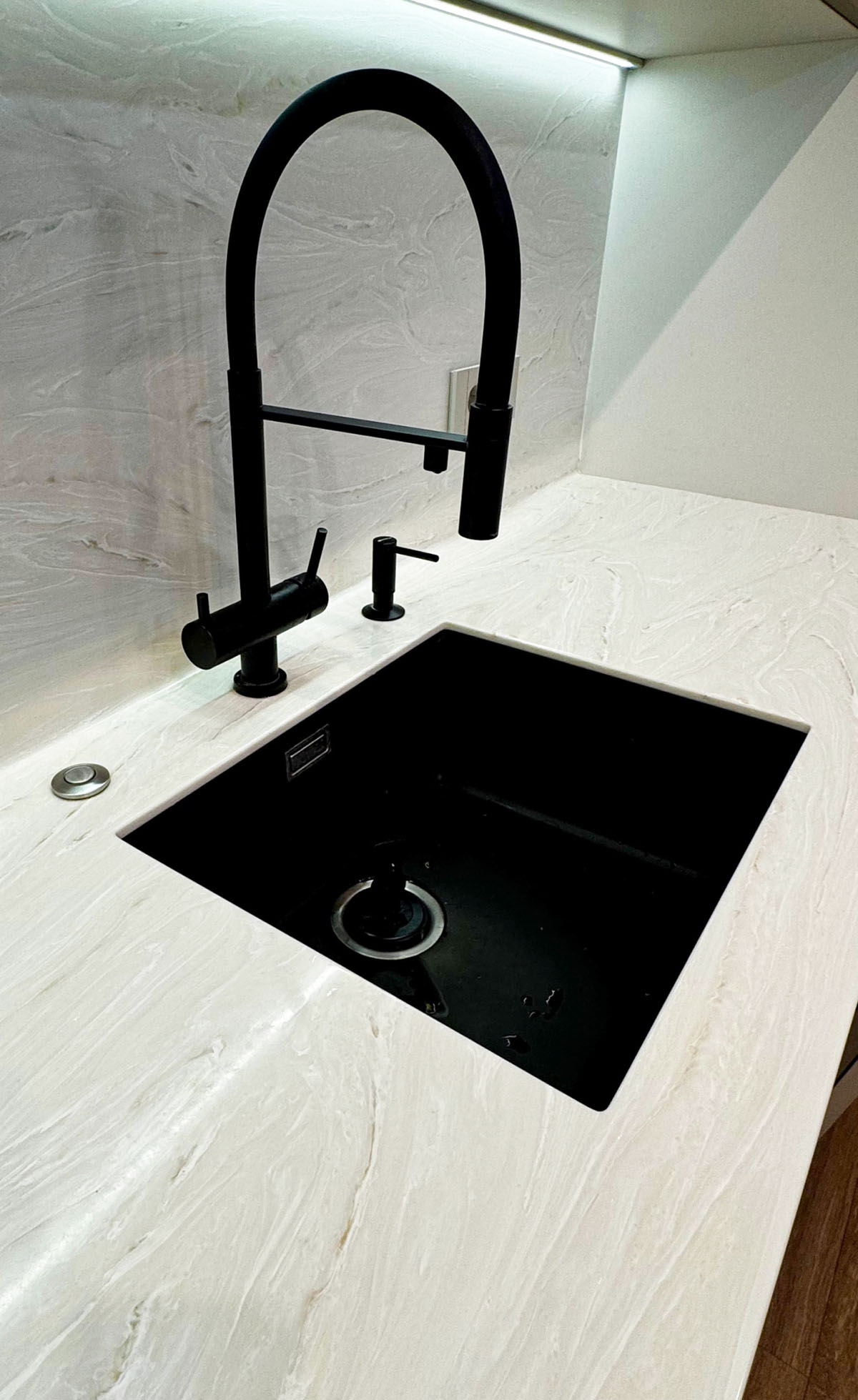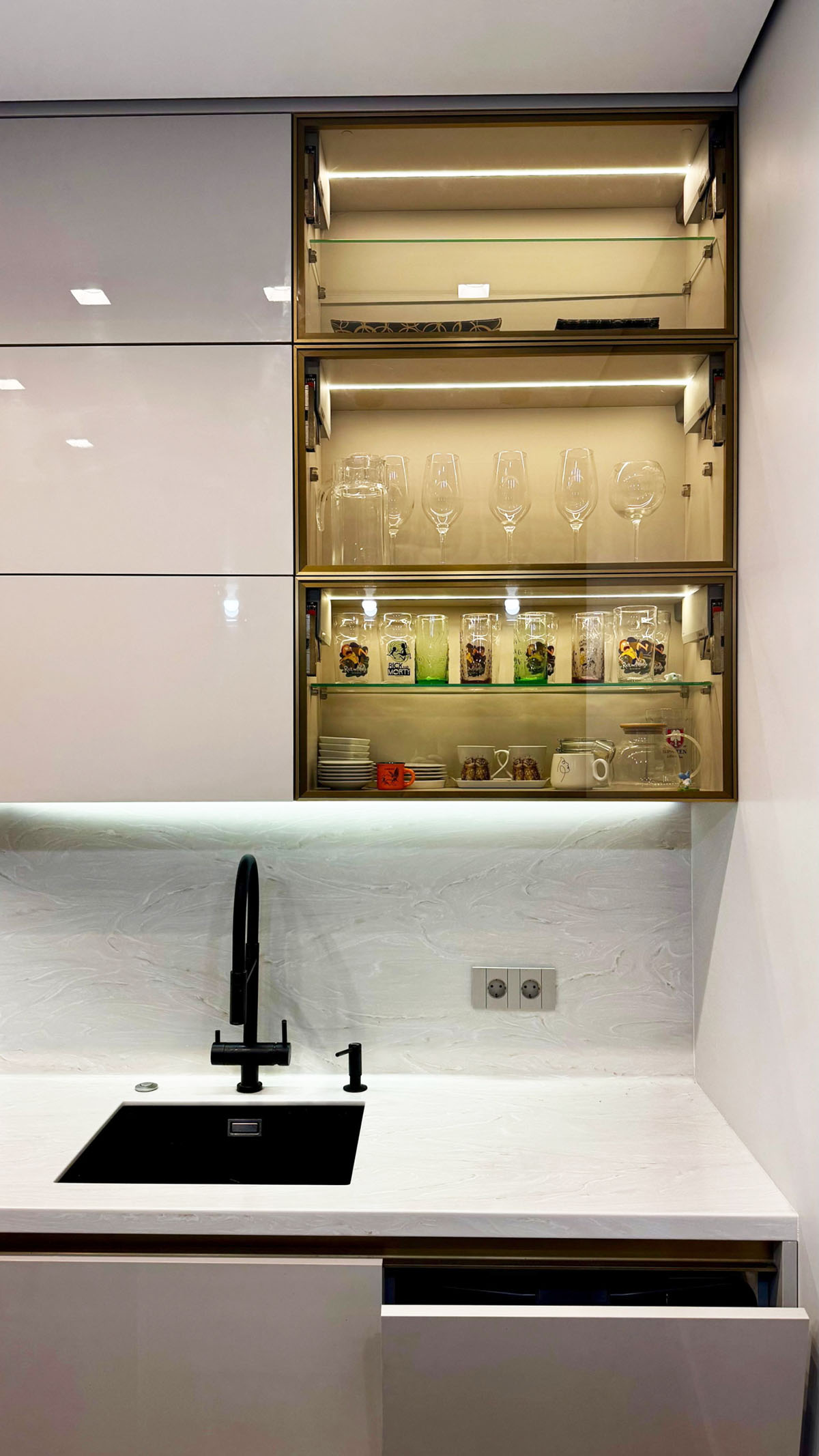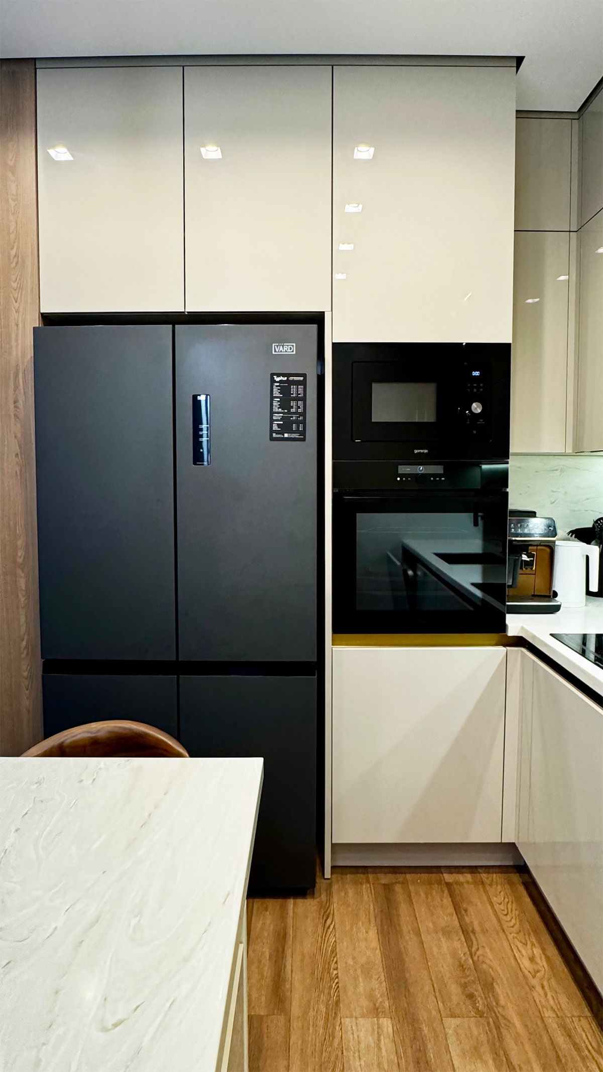 О проектеОписаниеФасады кухни выполнены в мягком и универсальном цвете "Кашемир", который создает атмосферу спокойствия и гармонии в интерьере. Элегантные золотые детали, такие как рамка со стеклом и профиль Gola, добавляют изысканности и шарма. Такой дизайн отлично подходит как для брутальных мужчин, ценящих стиль, так и для их внимательных партнеров — хранительниц домашнего уюта.