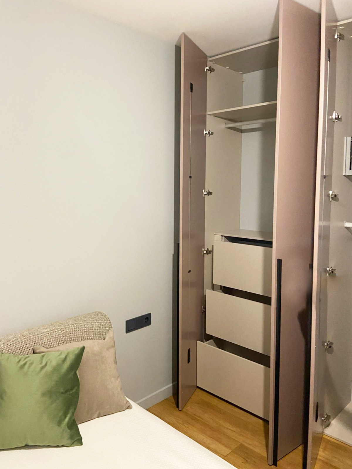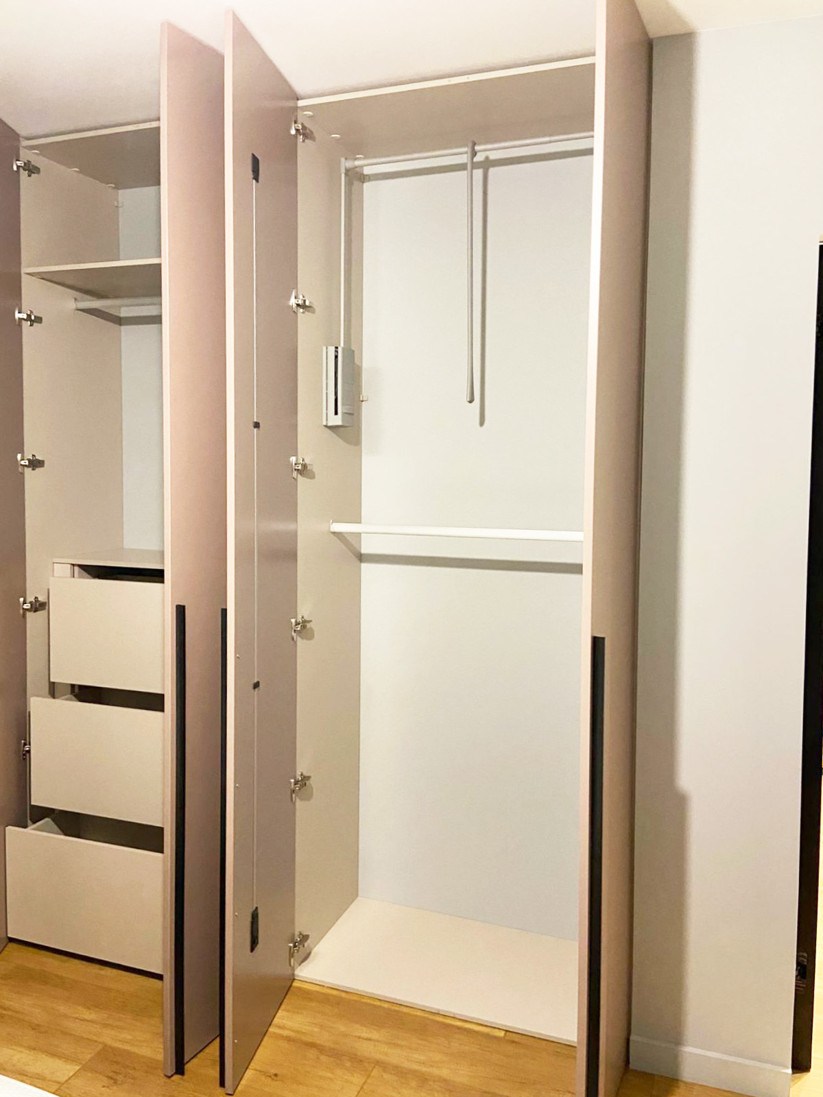 В этом проекте реализован встроенный шкаф в бежевом оттенке, выбранном из каталога RAL.