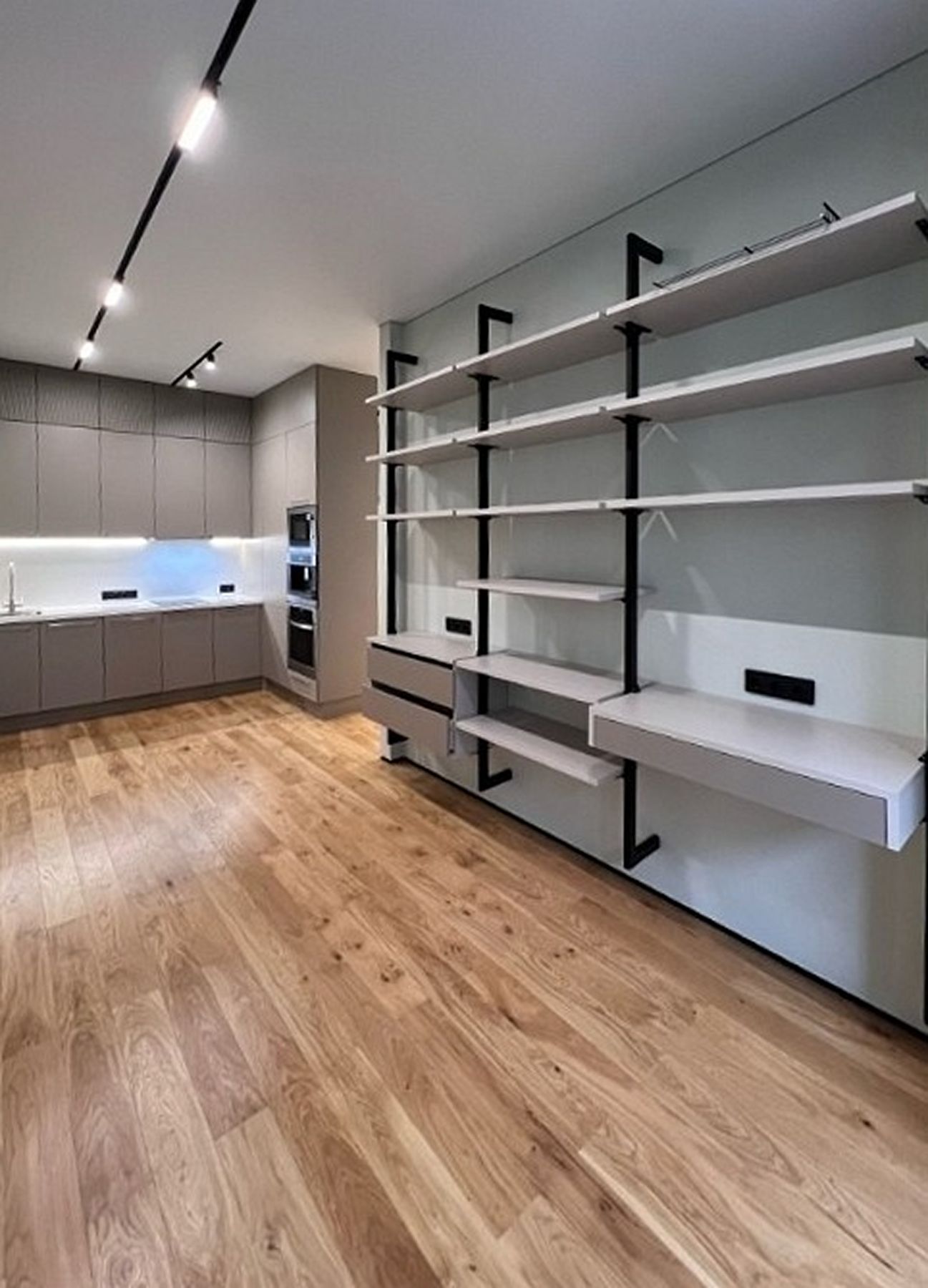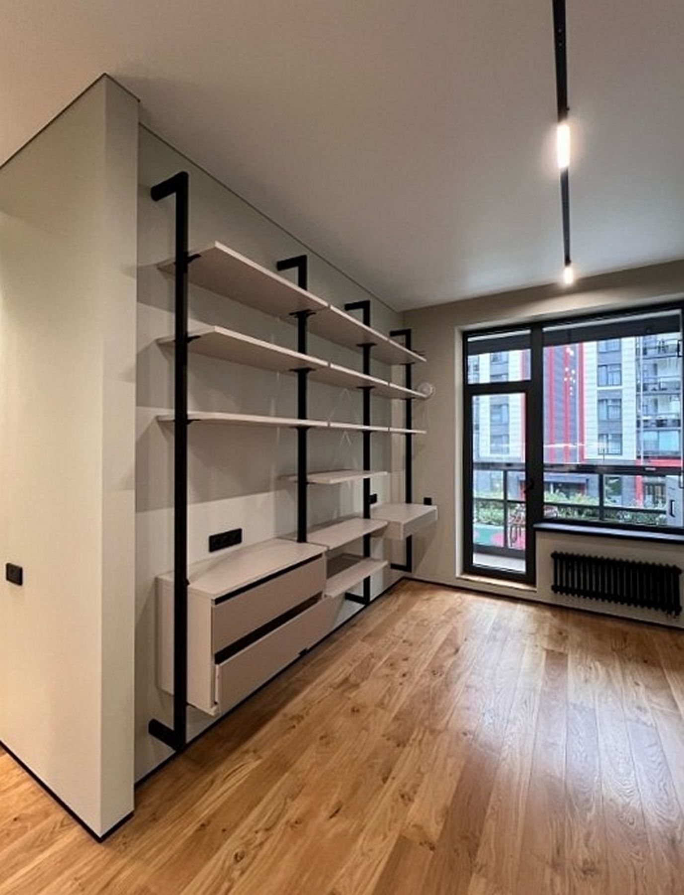 Вместо стандартной мебели мы создали гармоничный ансамбль, где кухня плавно перетекает в гостиную, формируя единое современное пространство. Открытая стеллажная система сохраняет ощущение легкости, предоставляя место для декора и личных вещей. В спальне разместили вместительный шкаф-купе.
