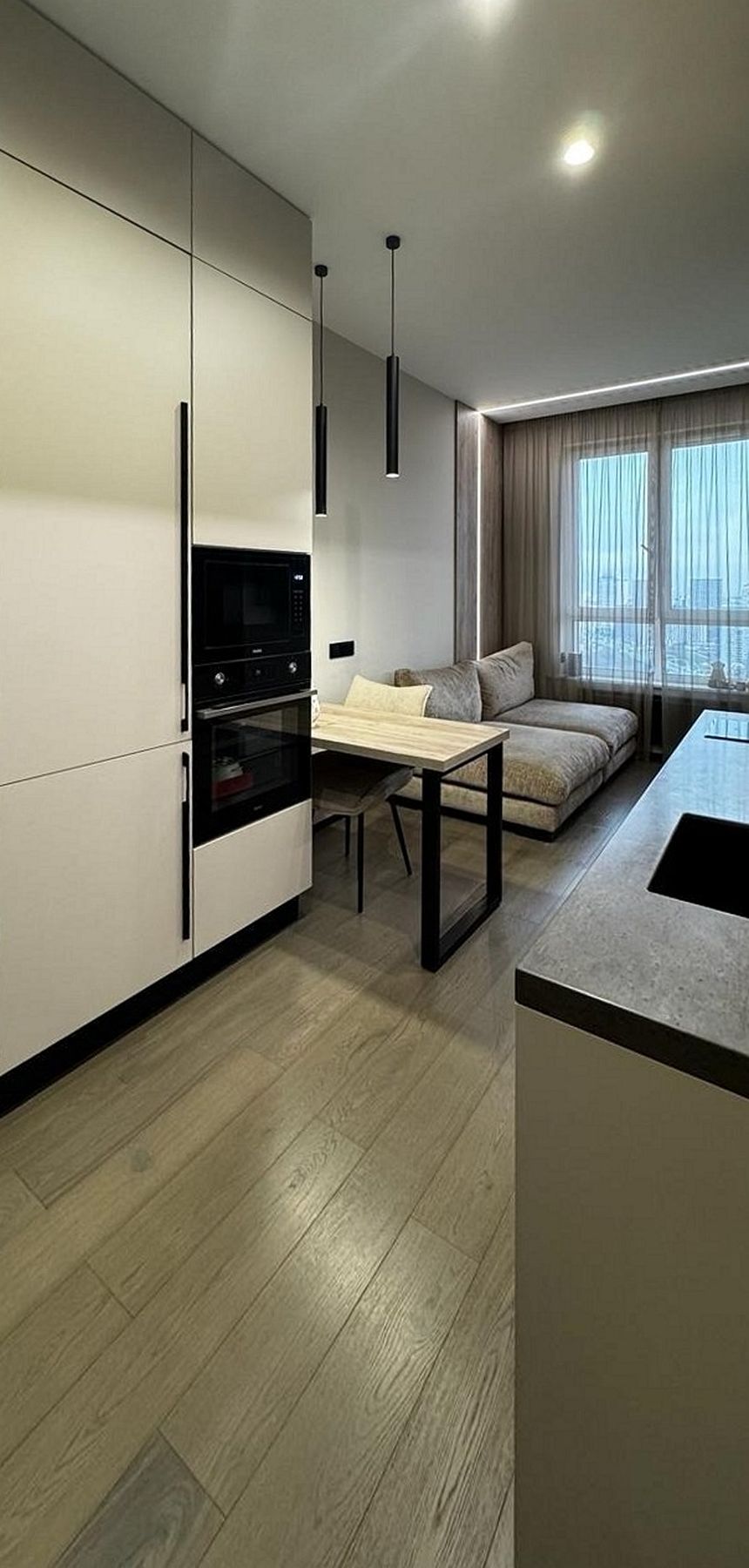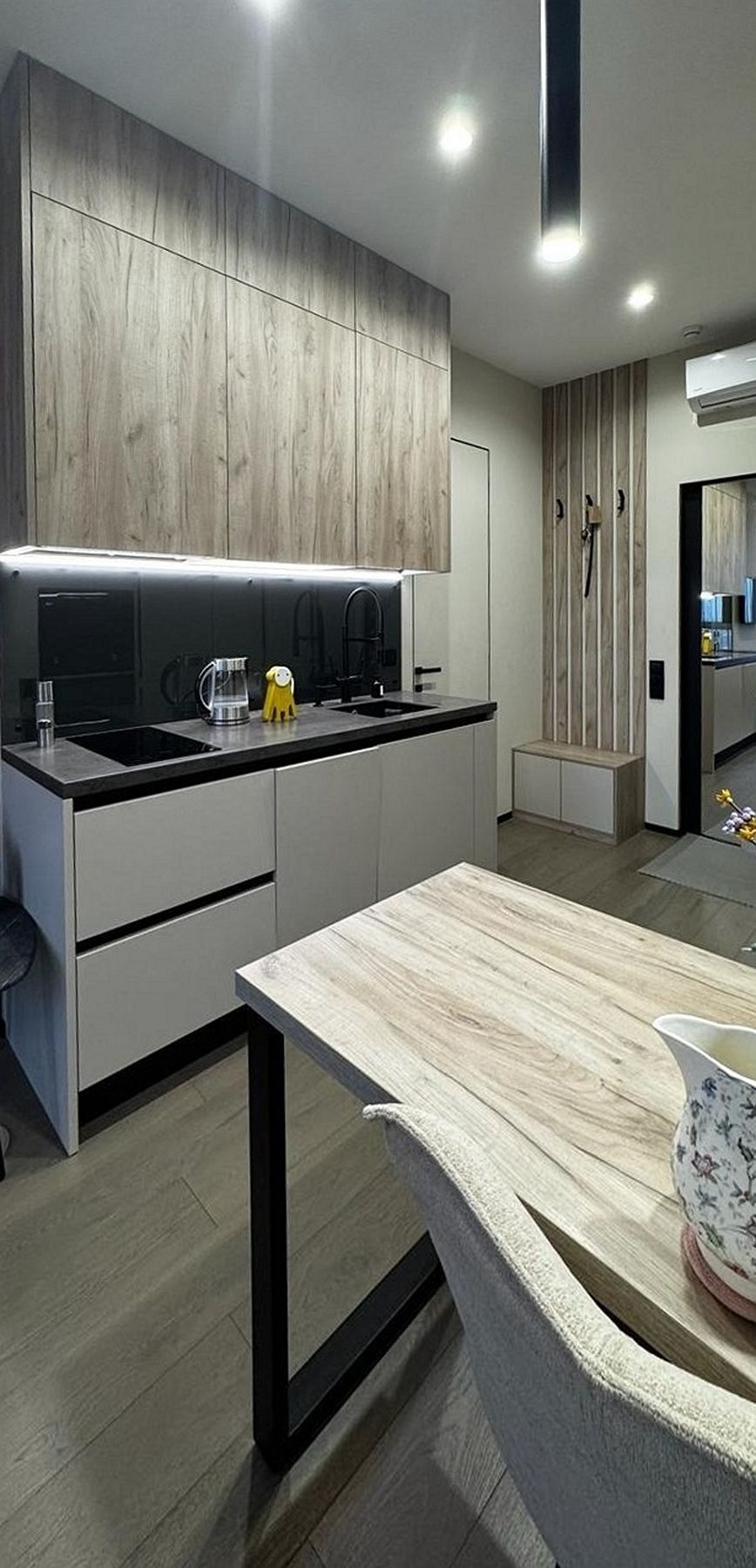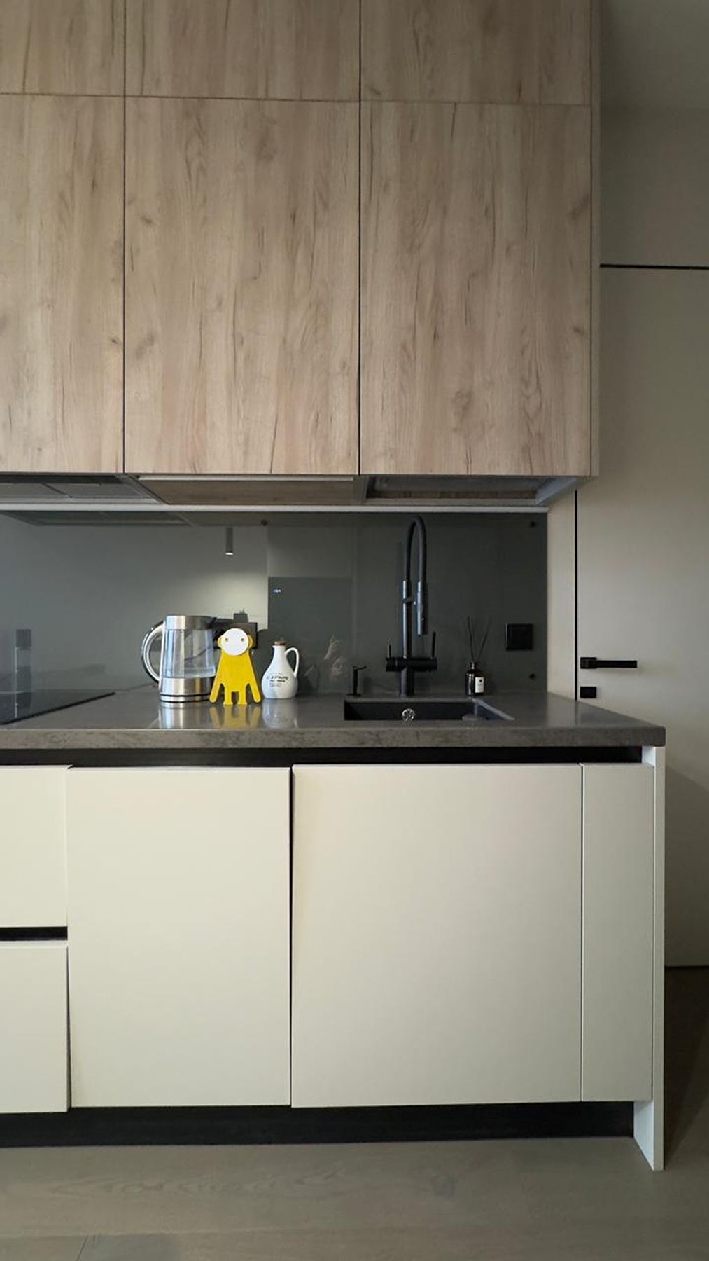 За основу взят нежный оттенок "кашемир", который создает спокойную и уютную атмосферу. Его уравновешивают натуральные древесные фасады и выразительные контрасты: темная столешница и фурнитура, включая профиль Gola и лаконичные ручки. Такой подход формирует сложный современный стиль – теплый, но с четким характером. Все предметы, от кухонного гарнитура до систем хранения, выдержаны в единой дизайнерской концепции.