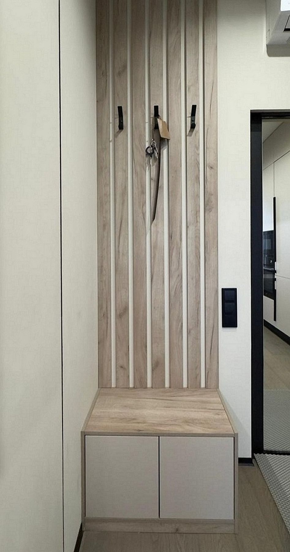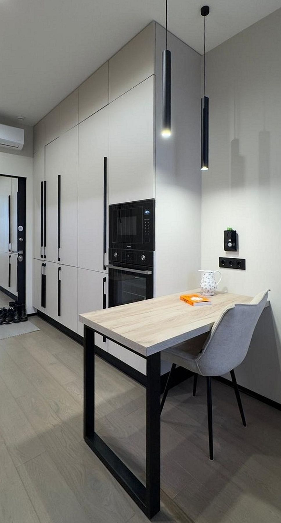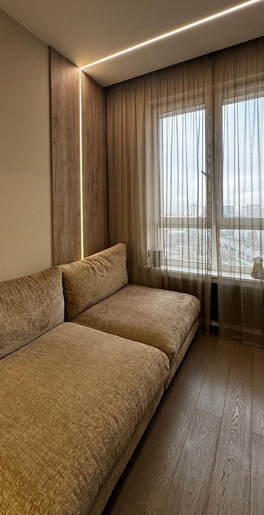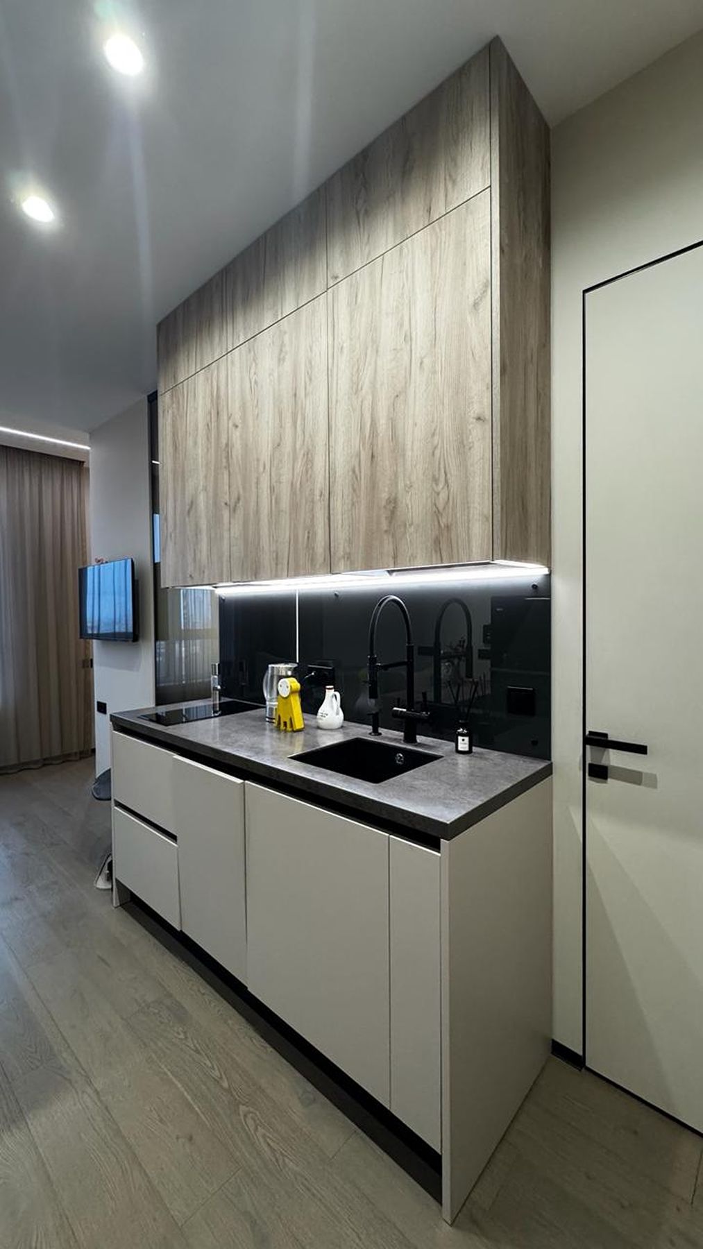 За основу взят нежный оттенок "кашемир", который создает спокойную и уютную атмосферу. Его уравновешивают натуральные древесные фасады и выразительные контрасты: темная столешница и фурнитура, включая профиль Gola и лаконичные ручки. Такой подход формирует сложный современный стиль – теплый, но с четким характером. Все предметы, от кухонного гарнитура до систем хранения, выдержаны в единой дизайнерской концепции.