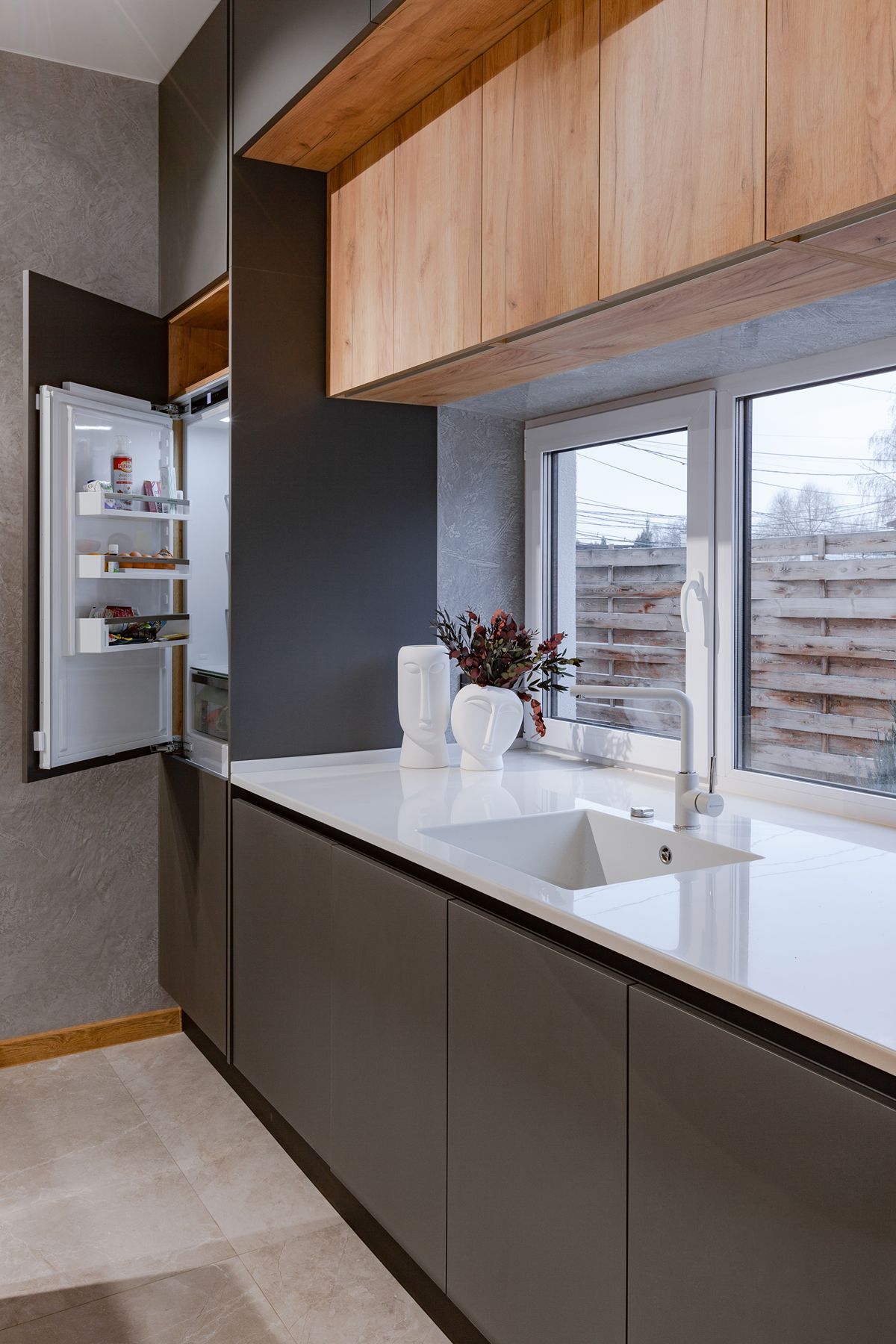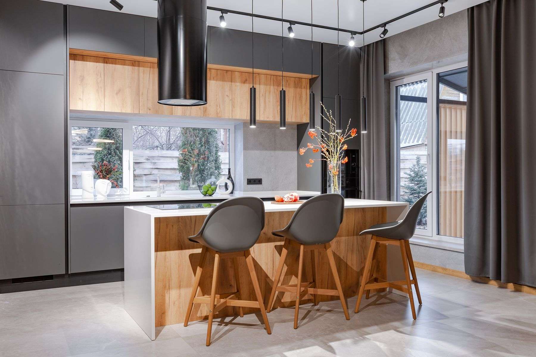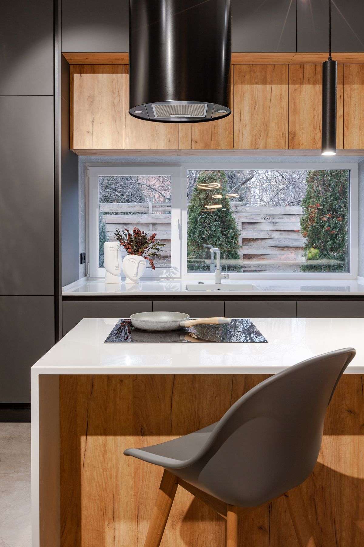 За гармонию отвечает комбинация материалов: суперматовые фасады Vector Touch темно-серого цвета задают индустриальный тон, а уютные фасады Mix 22 с текстурой дерева добавляют интерьеру природного тепла. Светлая столешница из искусственного камня освежает палитру. Кухонный остров стал композиционным центром, объединив в себе рабочую зону и место для общения. Стильная вытяжка-труба удачно перекликается с дизайном светильников, завершая целостный образ.