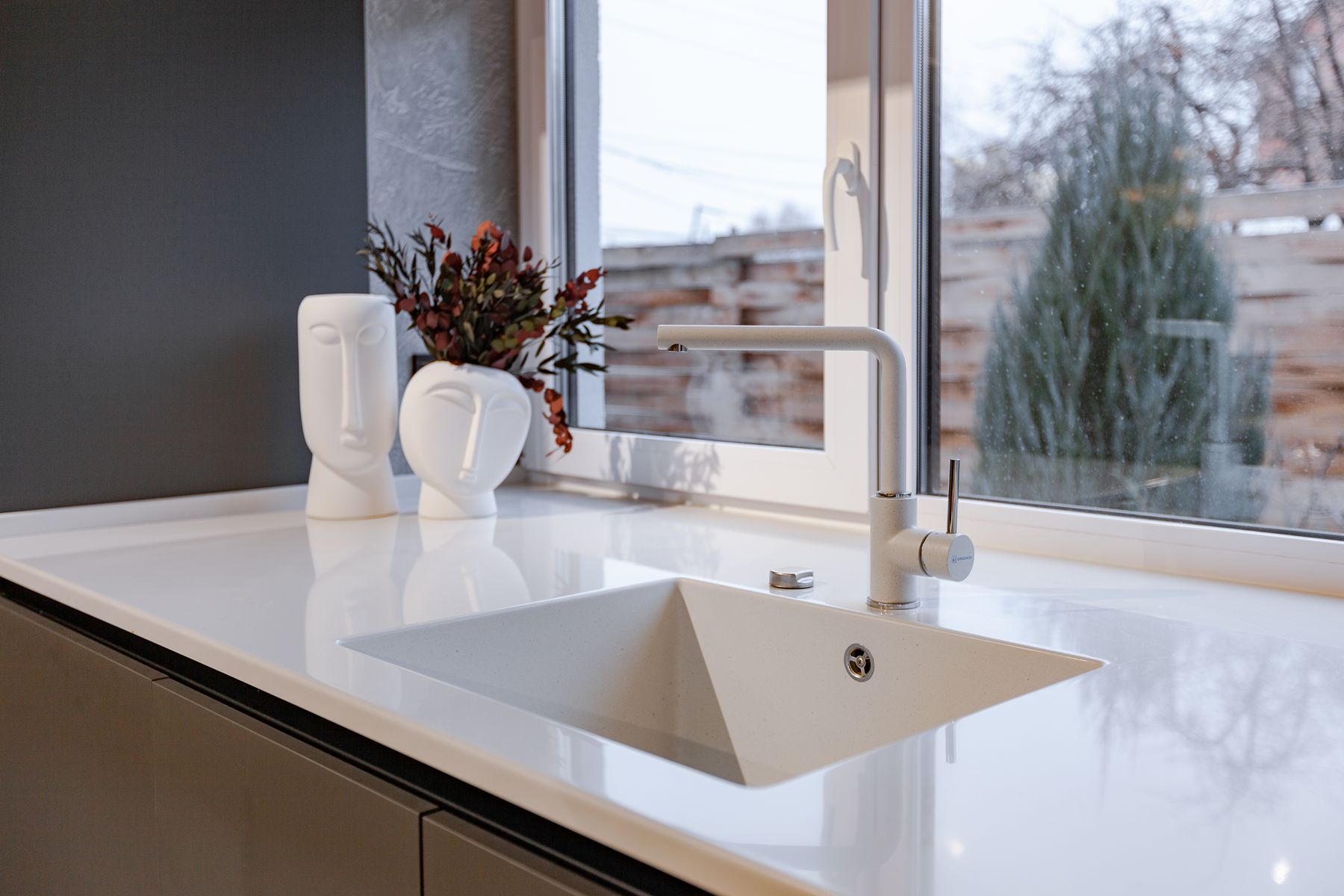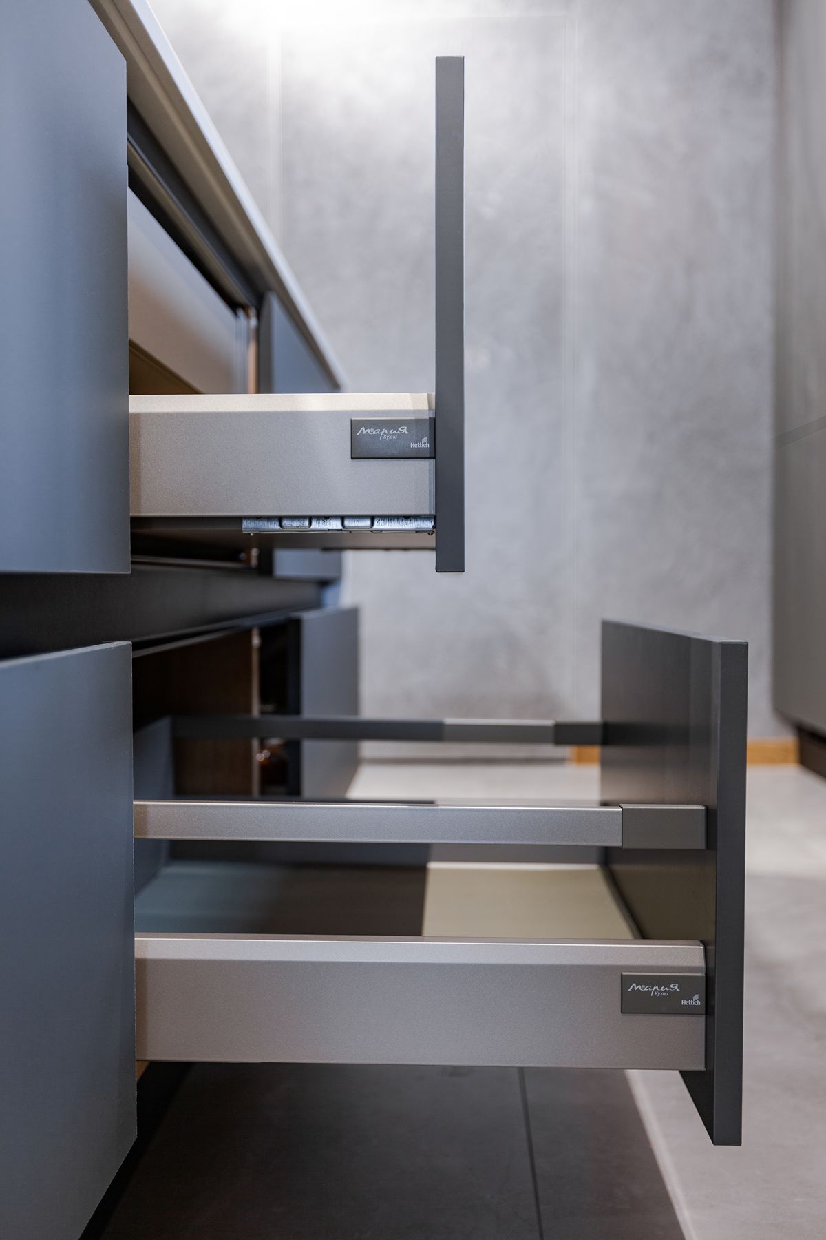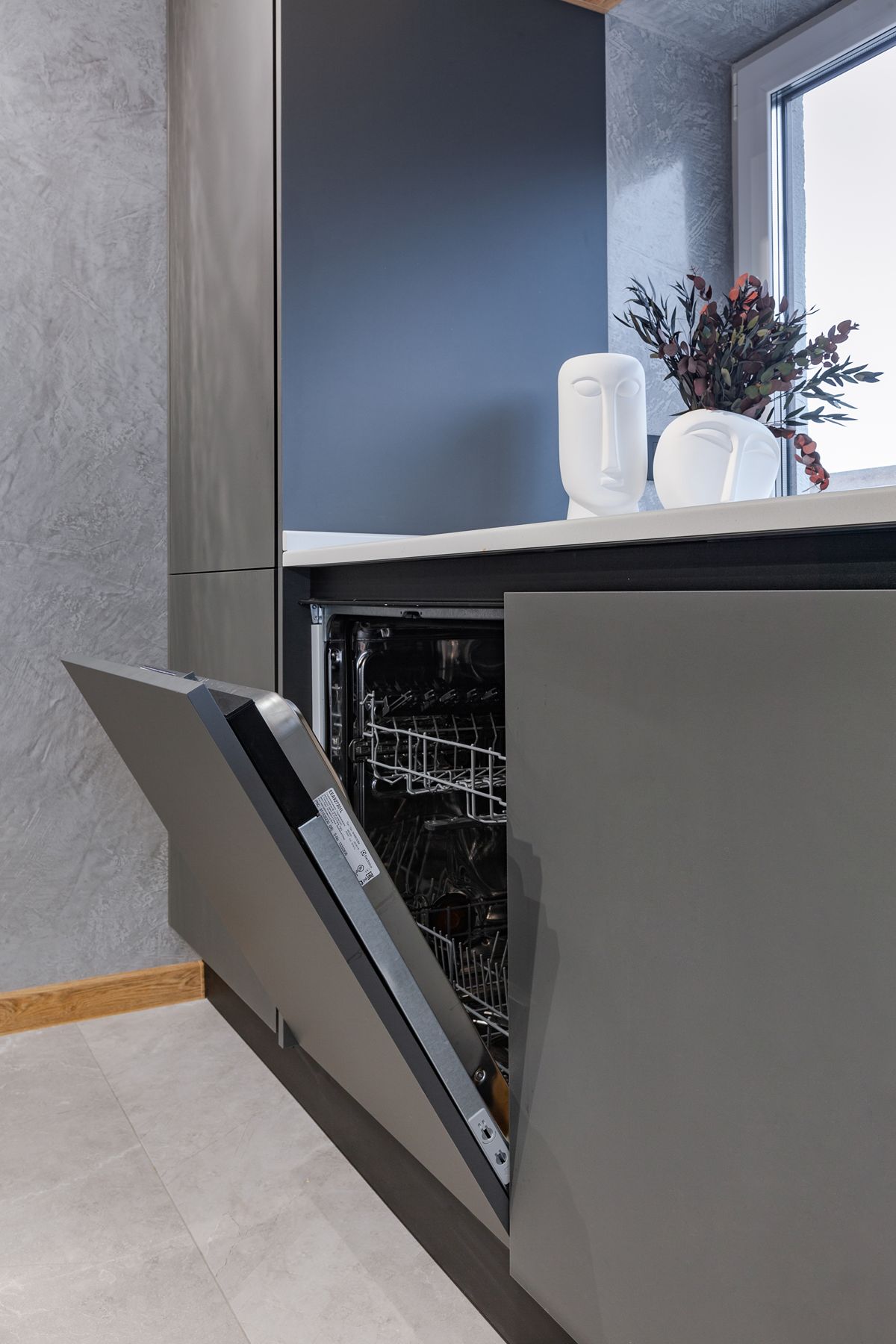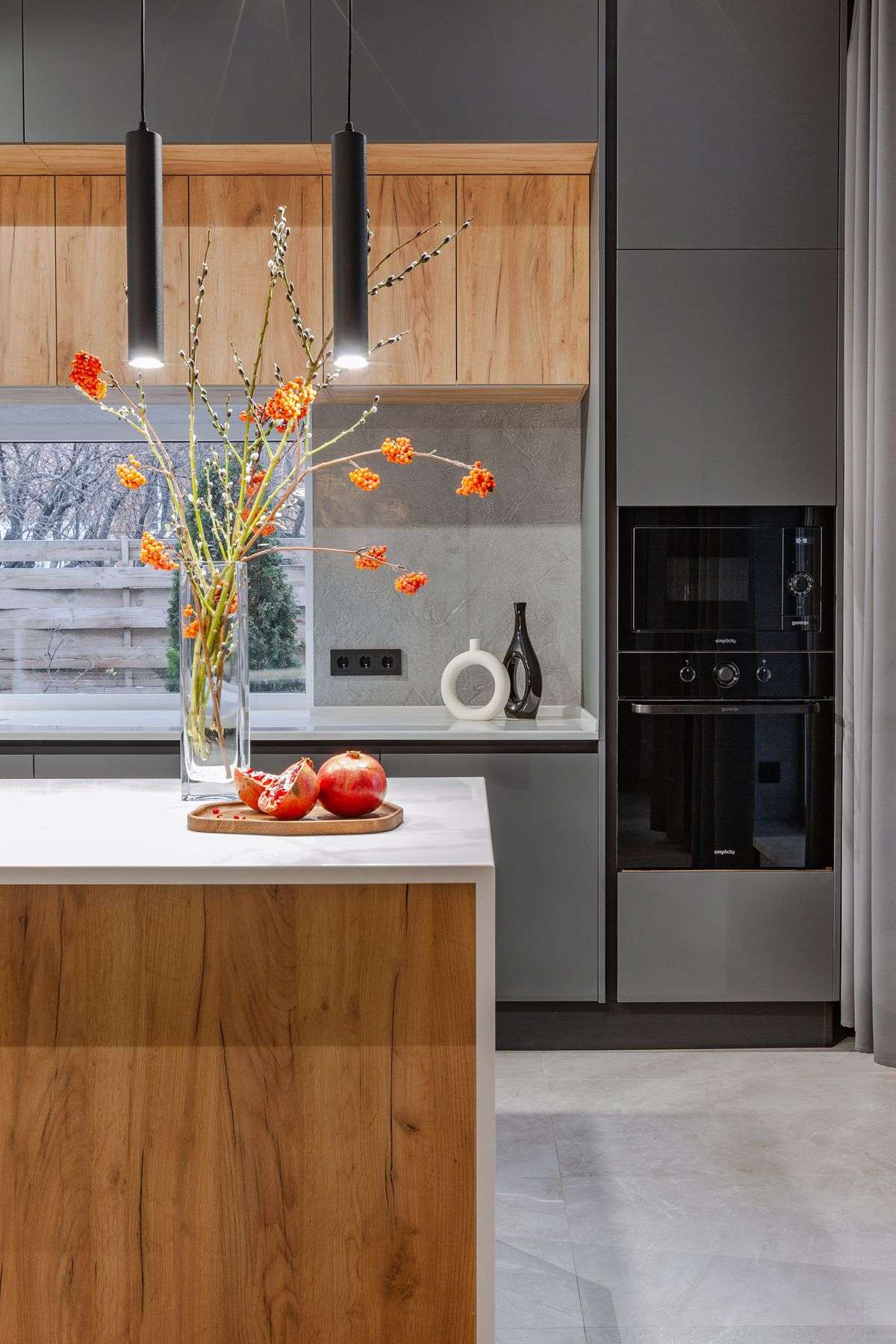 За гармонию отвечает комбинация материалов: суперматовые фасады Vector Touch темно-серого цвета задают индустриальный тон, а уютные фасады Mix 22 с текстурой дерева добавляют интерьеру природного тепла. Светлая столешница из искусственного камня освежает палитру. Кухонный остров стал композиционным центром, объединив в себе рабочую зону и место для общения. Стильная вытяжка-труба удачно перекликается с дизайном светильников, завершая целостный образ.