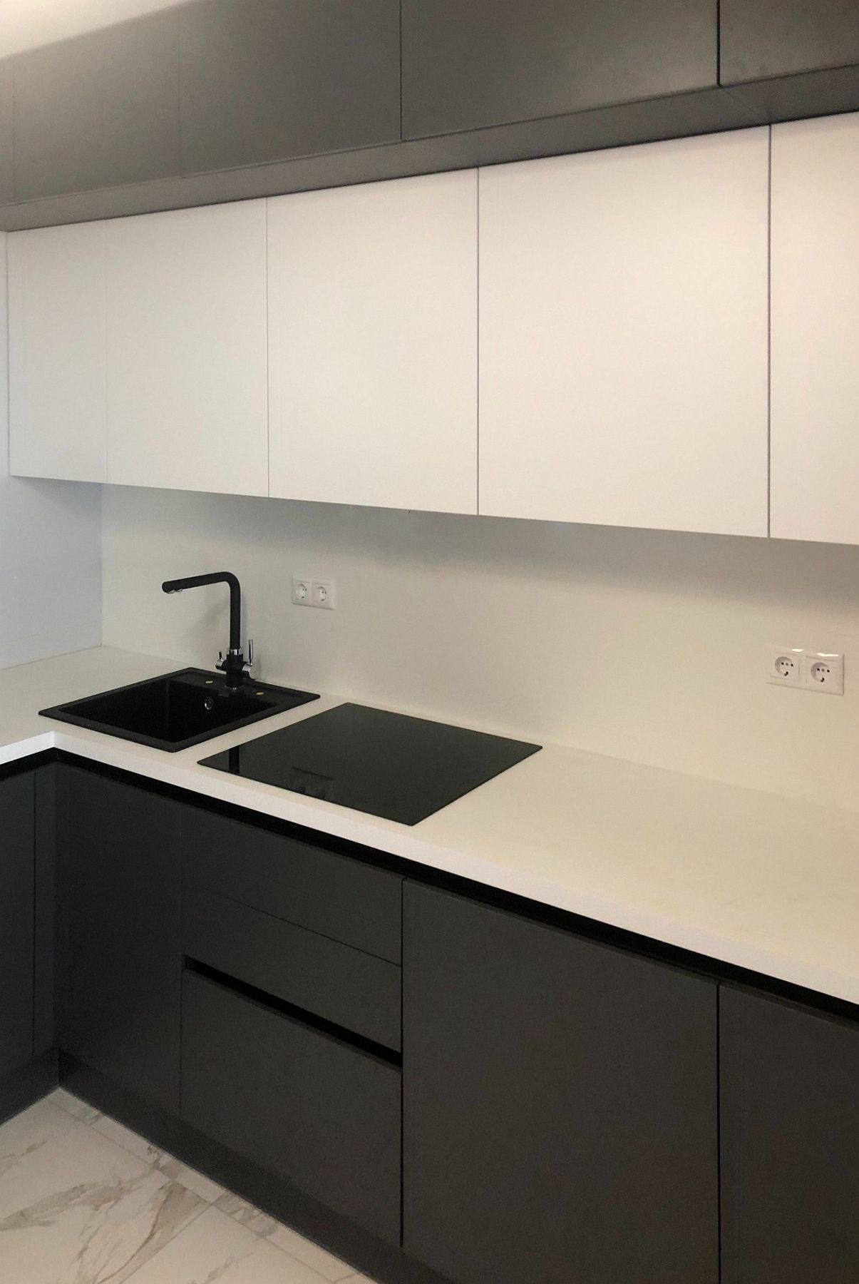 Нашим решением стала продуманная планировка, которая не только учитывает существующие подводки, но и делает процесс готовки максимально удобным. Эргономичная столешница и грамотно расположенные системы хранения обеспечили необходимое пространство для работы и размещения утвари. Эстетическую гармонию и современный вид подчеркивает лаконичный дизайн фасадов.