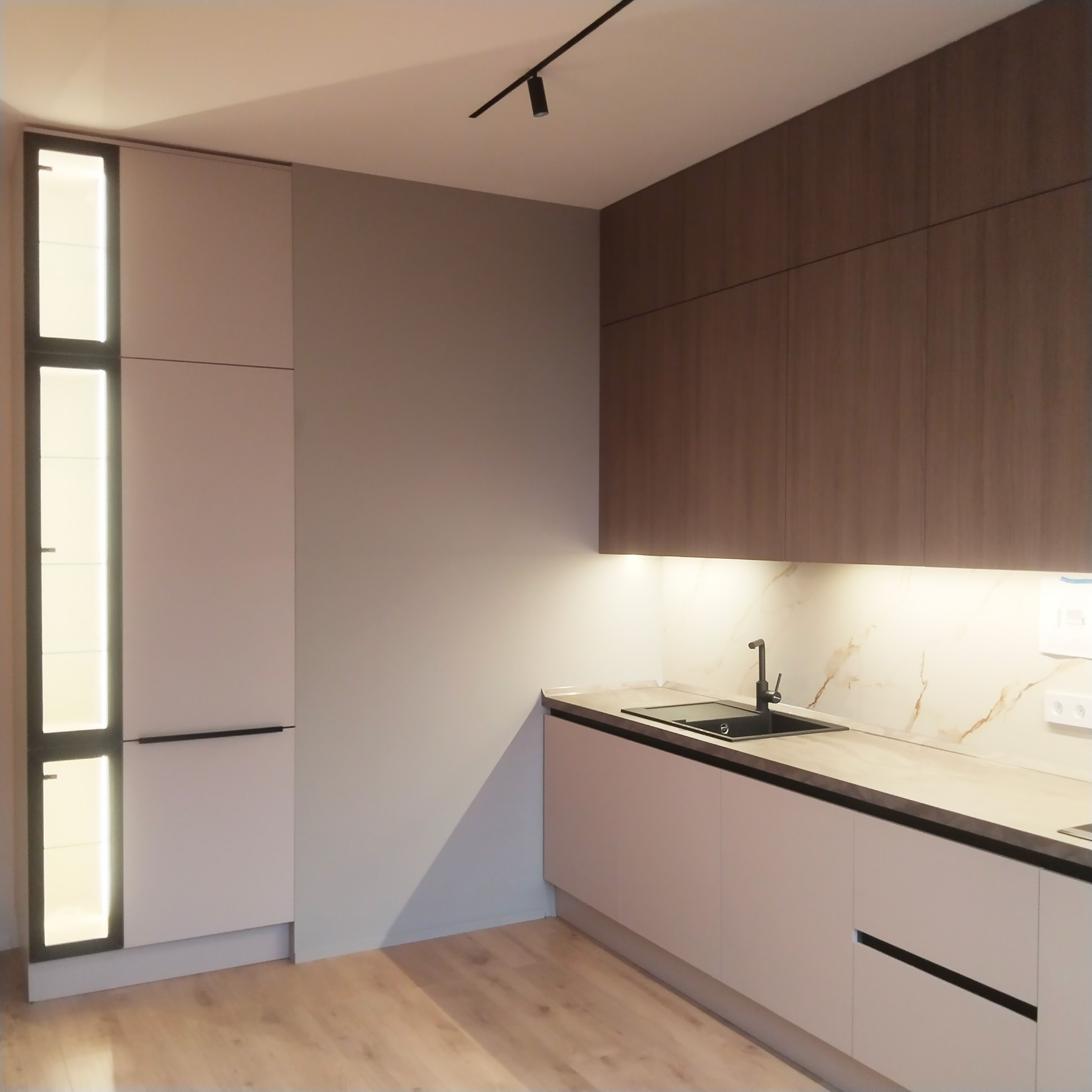 О проектеОписаниеРазработанный проект кухни в современном стиле для молодых пар — это идеальное решение для тех, кто ценит стиль, функциональность и комфорт.