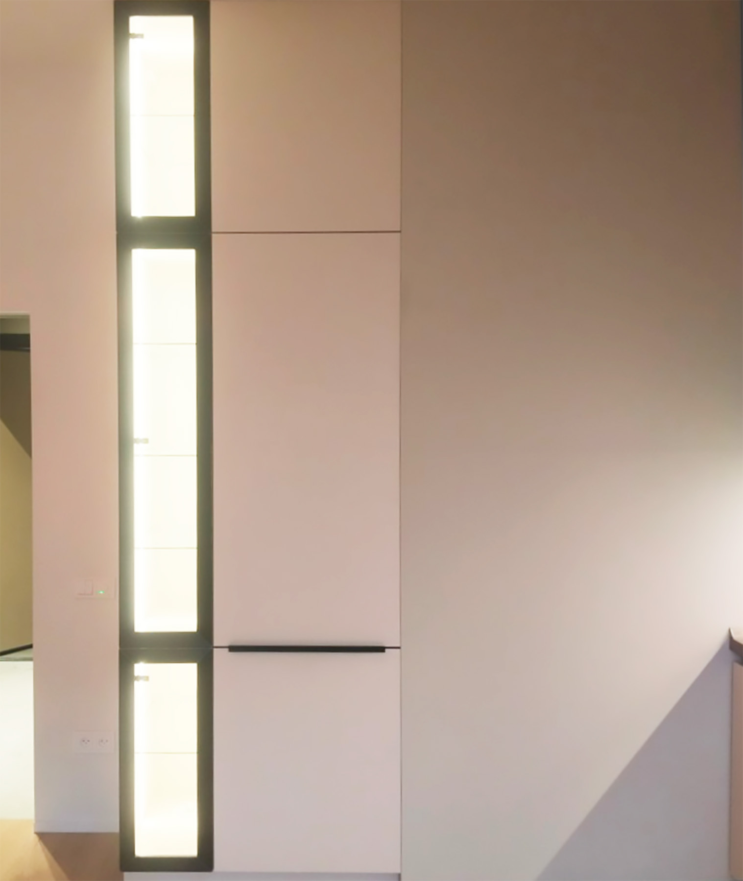 Особенностью данного кухонного проекта является витрина с внутренней подсветкой, добавляющая изюминку и современный акцент. Такой интерьер идеально подходит для молодоженов, ищущих стильную, функциональную кухню, дизайн которой отличается светлой палитрой, деревянными элементами и современными деталями.