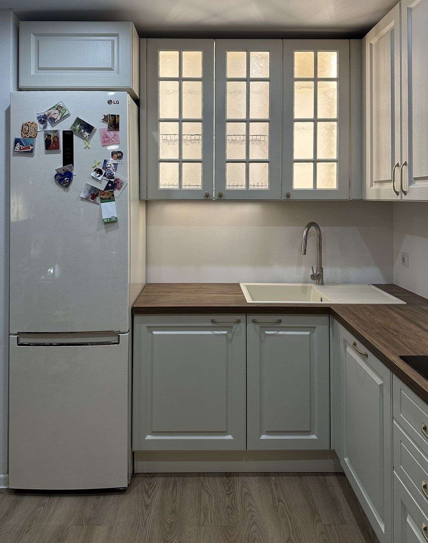 Мы выбрали классический стиль, который наполняет помещение теплом и уютом. Чтобы кухня в маленькой квартире не выглядела громоздко, некоторые верхние шкафы выполнили со стеклянными фасадами и внутренней подсветкой. Этот прием добавил интерьеру воздушности и легкого сияния. Весь гарнитур укомплектован встраиваемой техникой, а холодильник, благодаря точным замерам и проектированию, органично вписался в общий ряд, ничем не выдавая своего «нестандартного» происхождения.