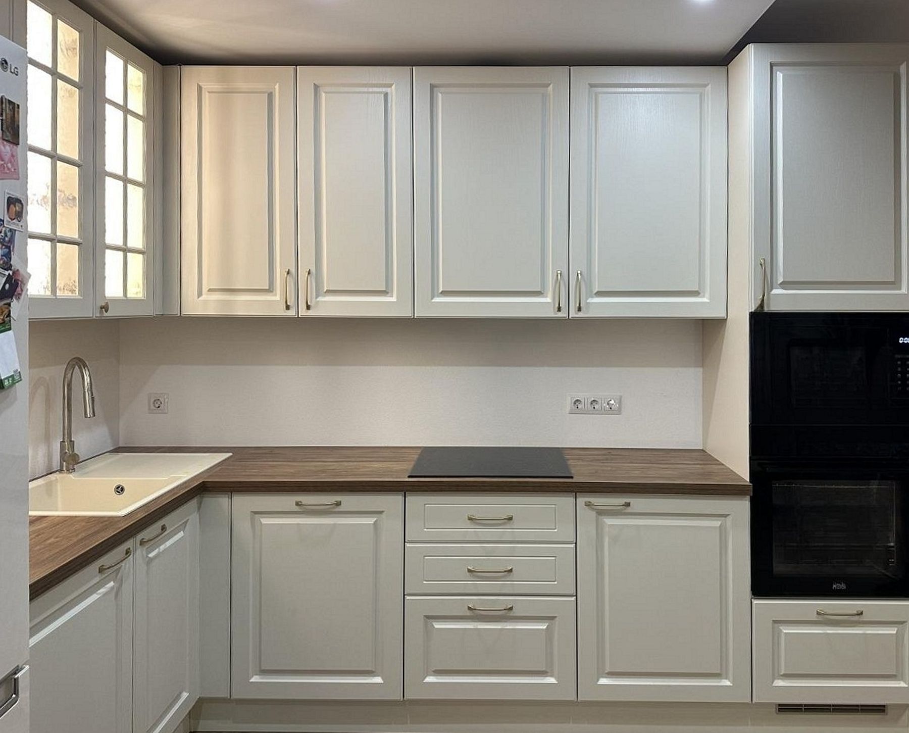 О проектеОписаниеЗадачей этого проекта было создать функциональную и стильную кухню для молодой пары, экономя каждый сантиметр пространства. Ключевым вызовом стала интеграция уже имеющегося отдельно стоящего холодильника в общий дизайн. Нашим решением стал кухонный гарнитур в светлой гамме. Он визуально объединил всю технику и создал ощущение целостности.