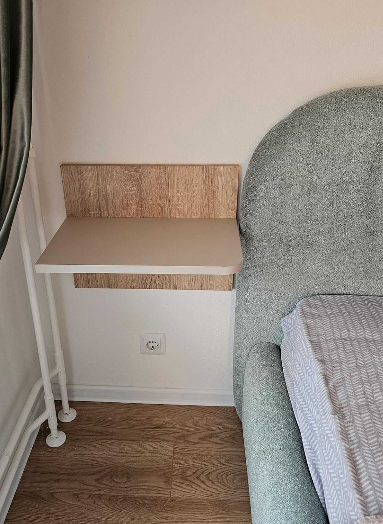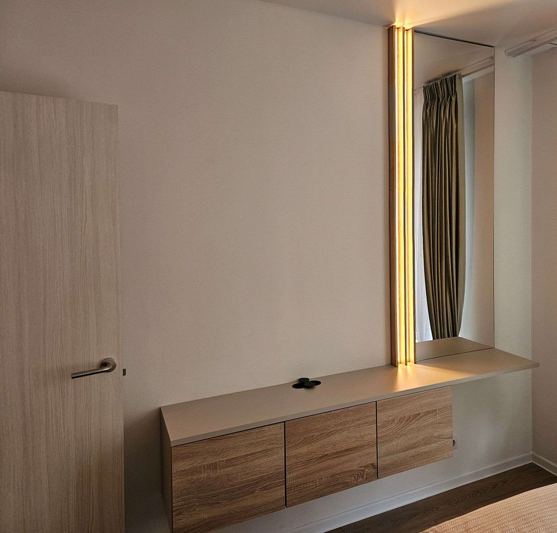 Ключевой элемент – шкаф в нишу, который экономит пространство и выглядит как часть стены. Его особенность – открытая полка, плавно переходящая в удобный прикроватный столик. Справа организована многофункциональная зона: она начинается как зона для ТВ и продолжается в качестве туалетного столика с большим зеркалом и встроенной подсветкой. Такое решение позволяет отказаться от лишней мебели, сохраняя порядок и обеспечивая комфорт.