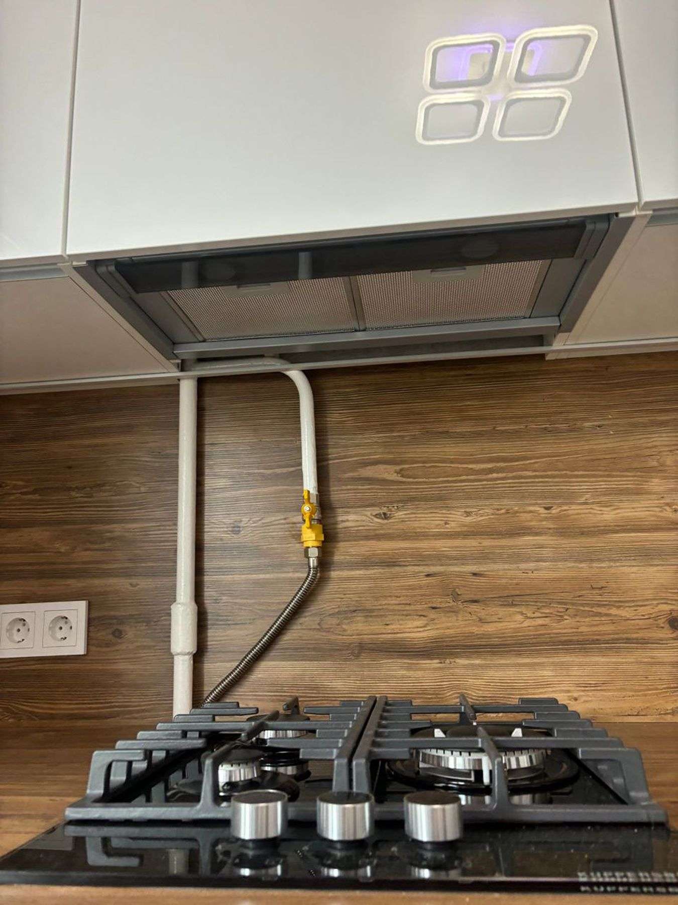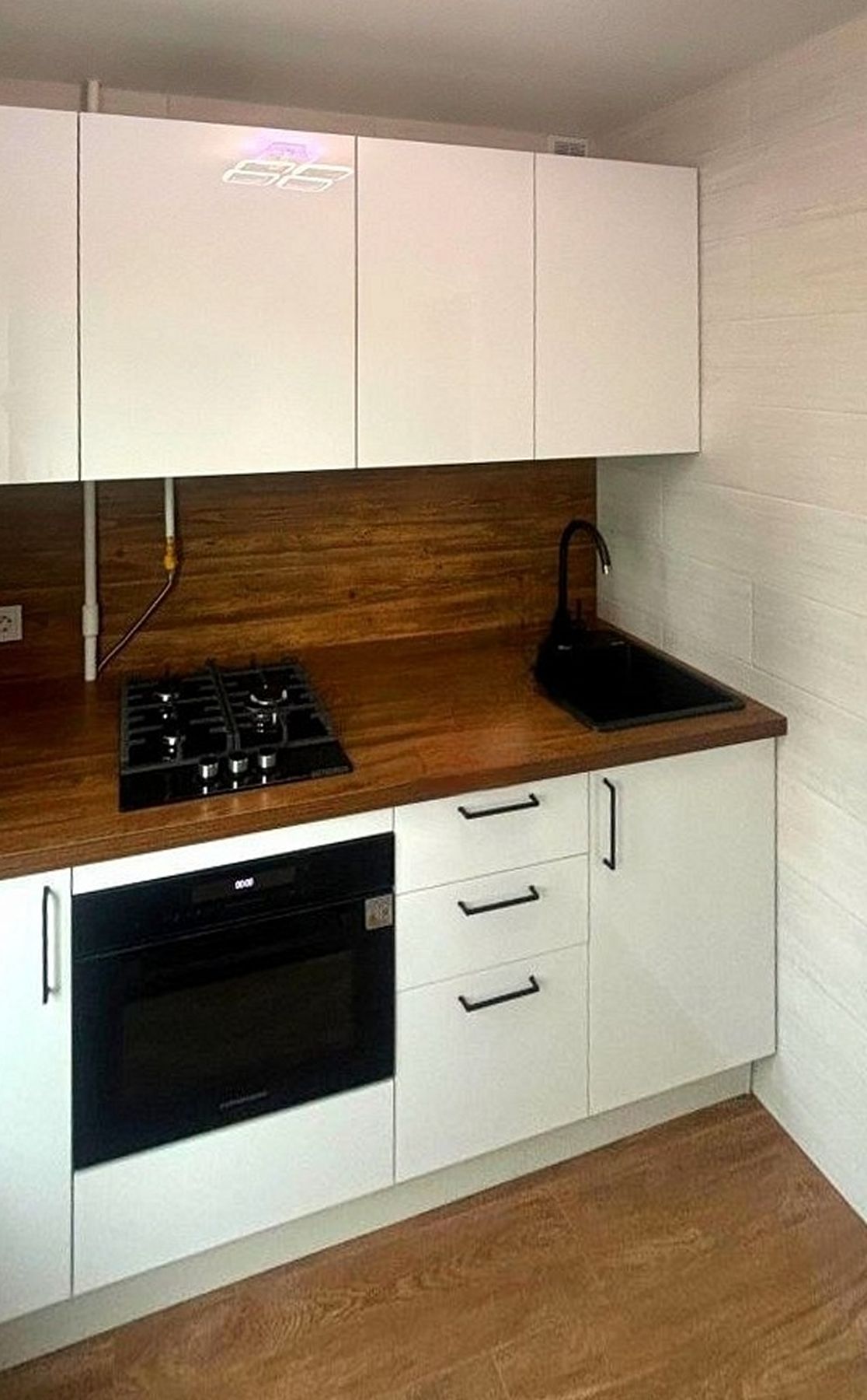 Глянцевые белые фасады формируют яркий, отражающий свет акцент. Они визуально расширяют пространство, наполняя его чистотой и стильным блеском. Для создания теплого баланса выбрана столешница из ЛДСП с выразительной текстурой дерева. Ее глубина была увеличена, что дало дополнительное место для готовки и размещения утвари. Такой прием позволил сохранить ощущение простора, добавив при этом функциональности и уюта.