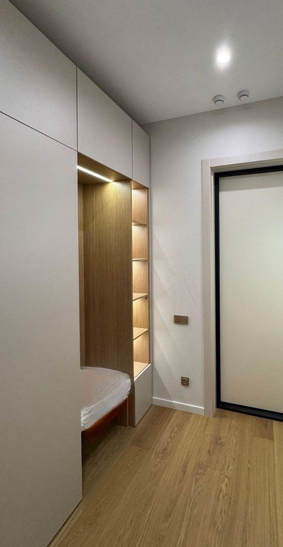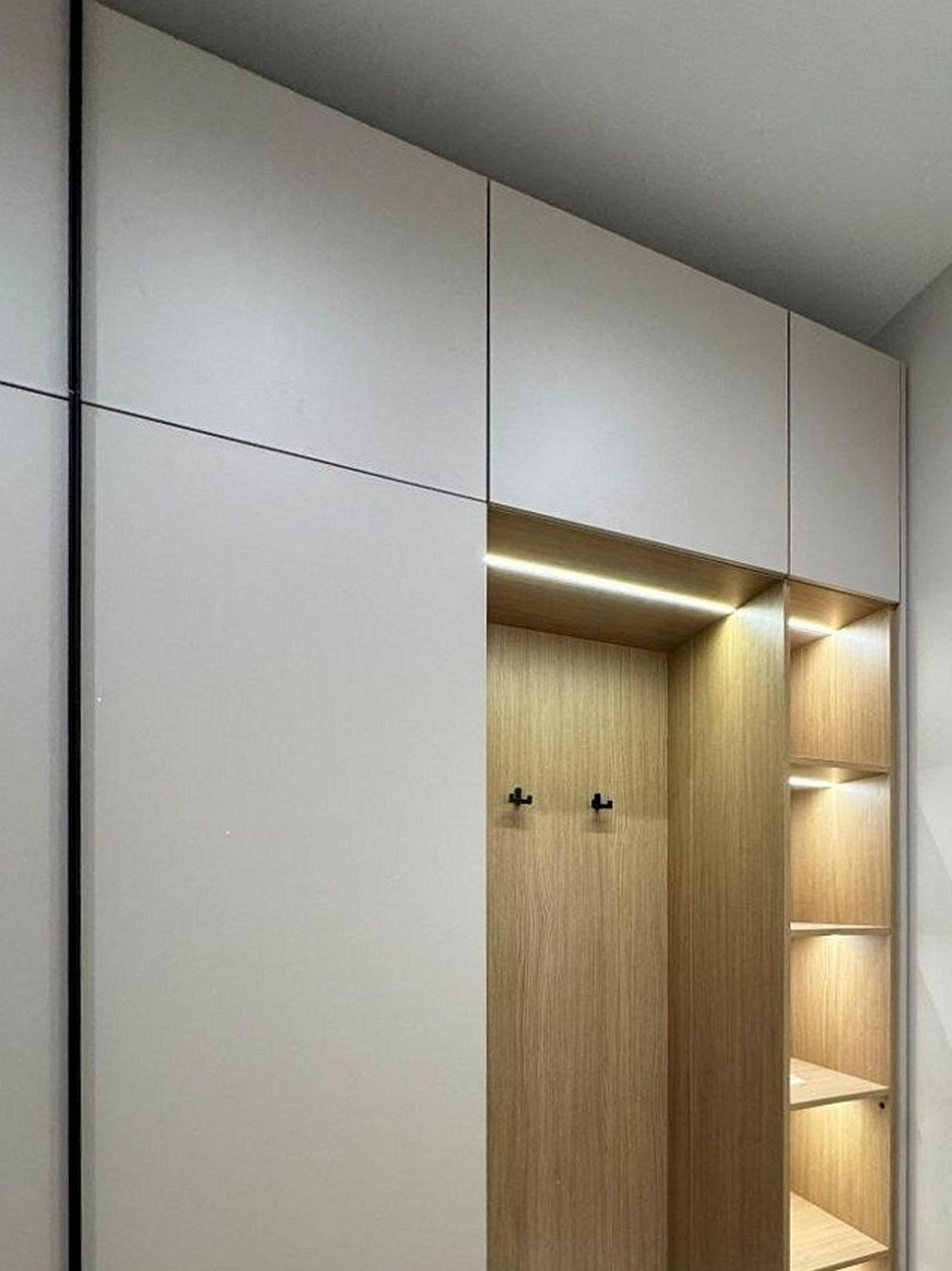 Основу дизайна составляют гладкие фасады в нейтральном цвете "кашемир". Этот оттенок придает пространству элегантность и визуальную легкость. Контраст и тепло вносят вставки под дерево с выразительной натуральной фактурой. Для завершенного лаконичного вида мы использовали скрытые ручки. Такой встроенный шкаф не загромождает комнату, обеспечивая при этом максимум функциональности.
