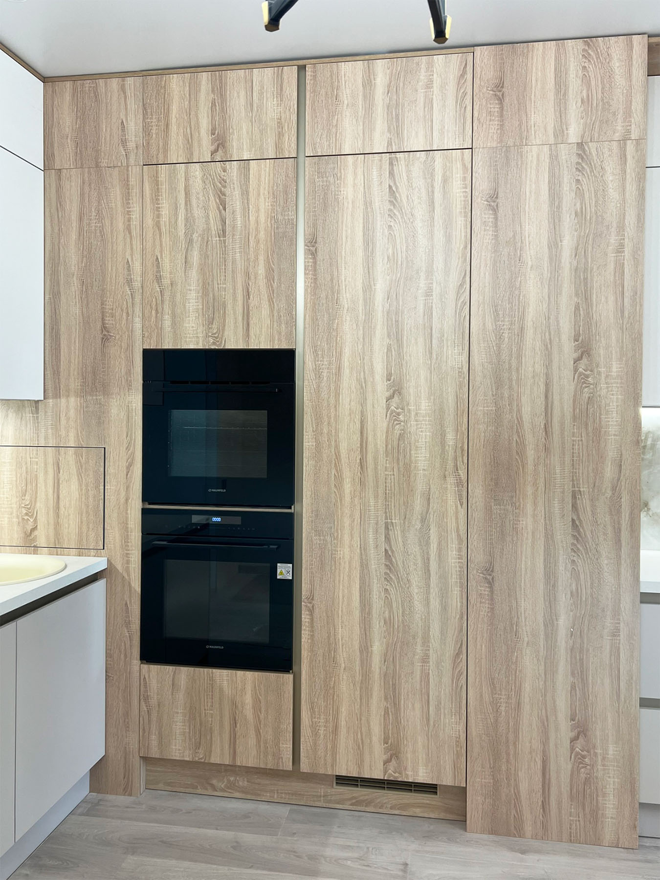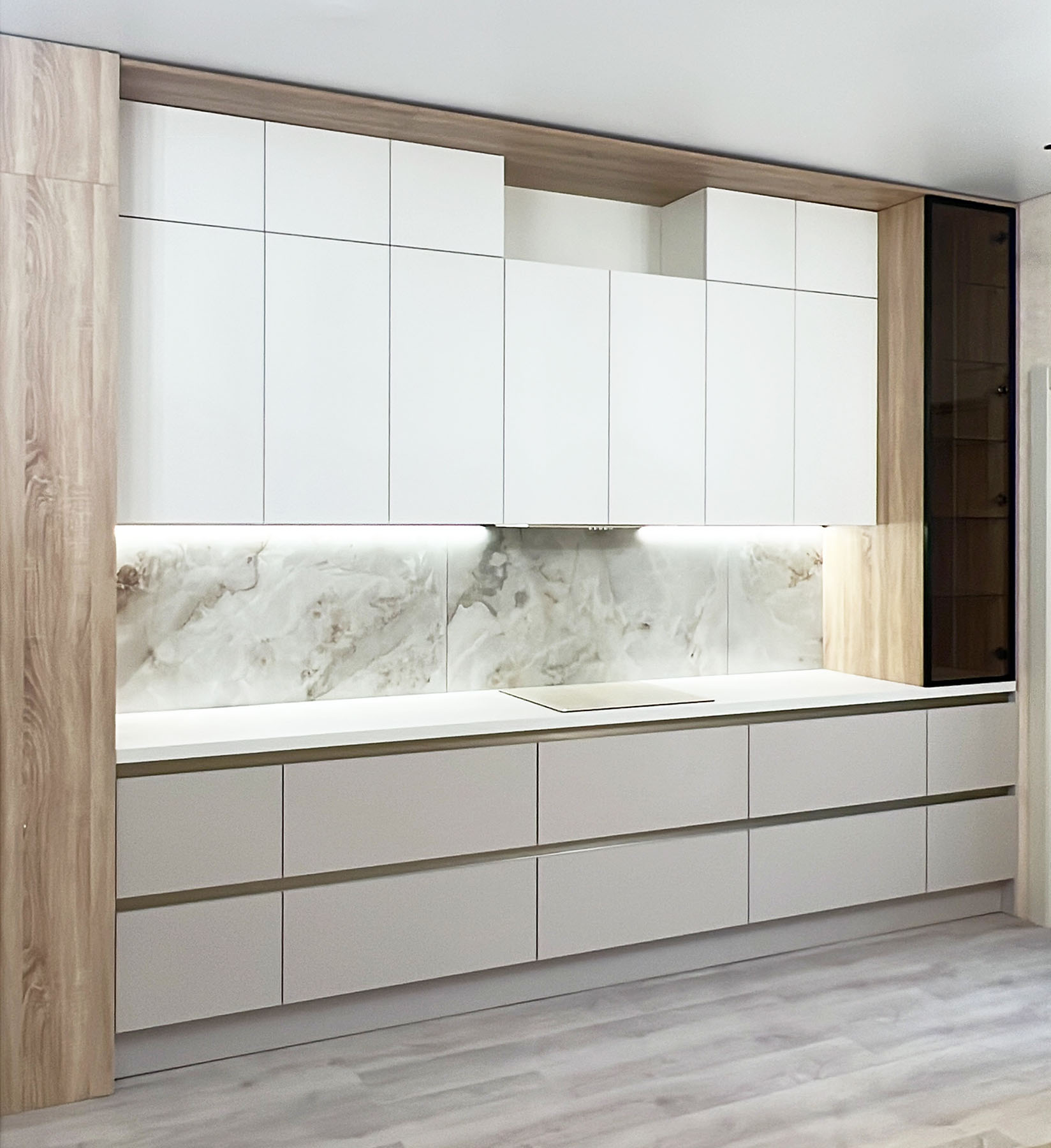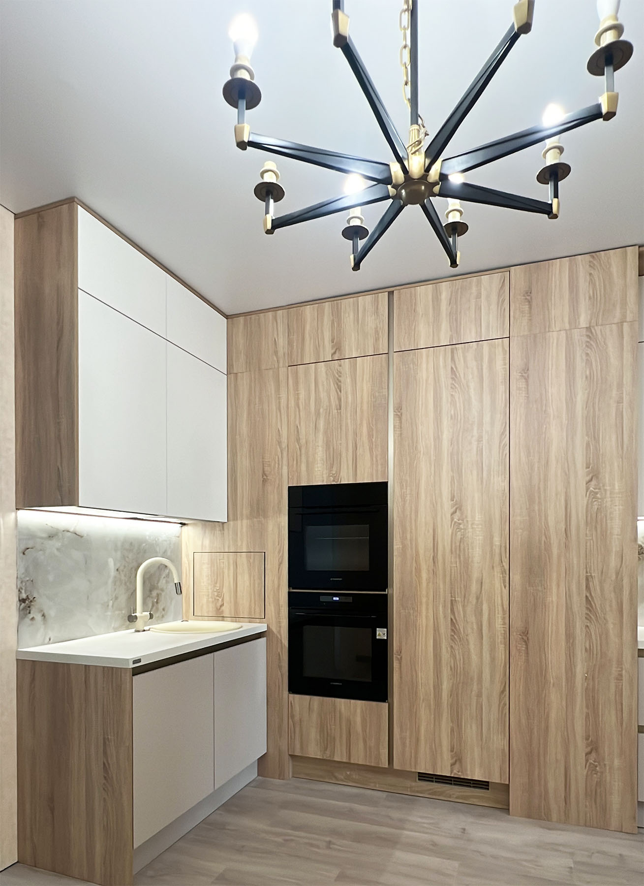 При выборе цвета хотелось совместить имитацию природных материалов с нежными светлыми цветами фасадов. Акцент берут на себя черные элементы - духовой шкаф, который перекликается с тонированным стеклом в черной алюминиевой рамке.