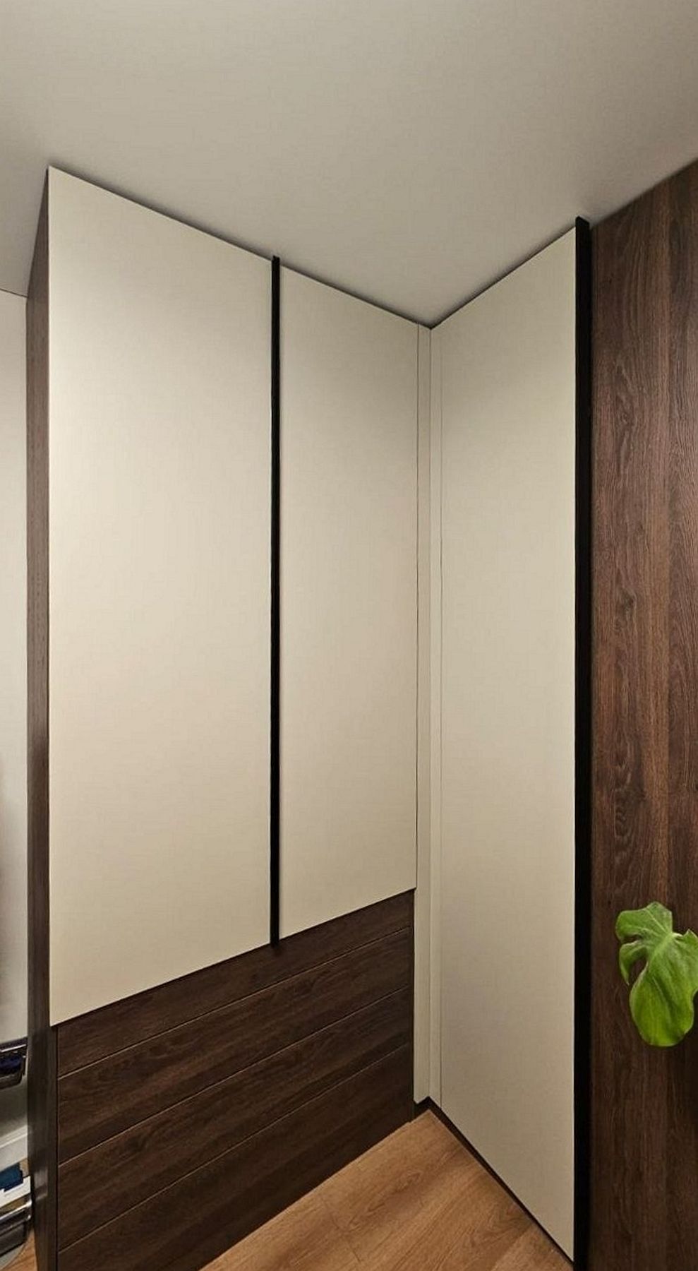 Шкаф выполнен в актуальной минималистичной эстетике: фасады без ручек с системой push-to-open создают идеально гладкую поверхность с плавными линиями. Успокаивающий зеленый оттенок на фасадах наполняет комнату свежестью, а контрастный цвет темного дерева добавляет графичности, солидности и тепла. Такой дизайн делает шкаф самостоятельным арт-объектом.