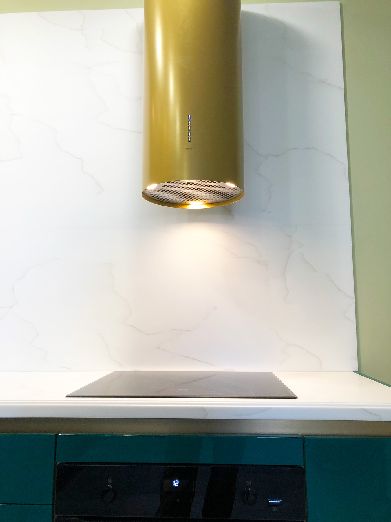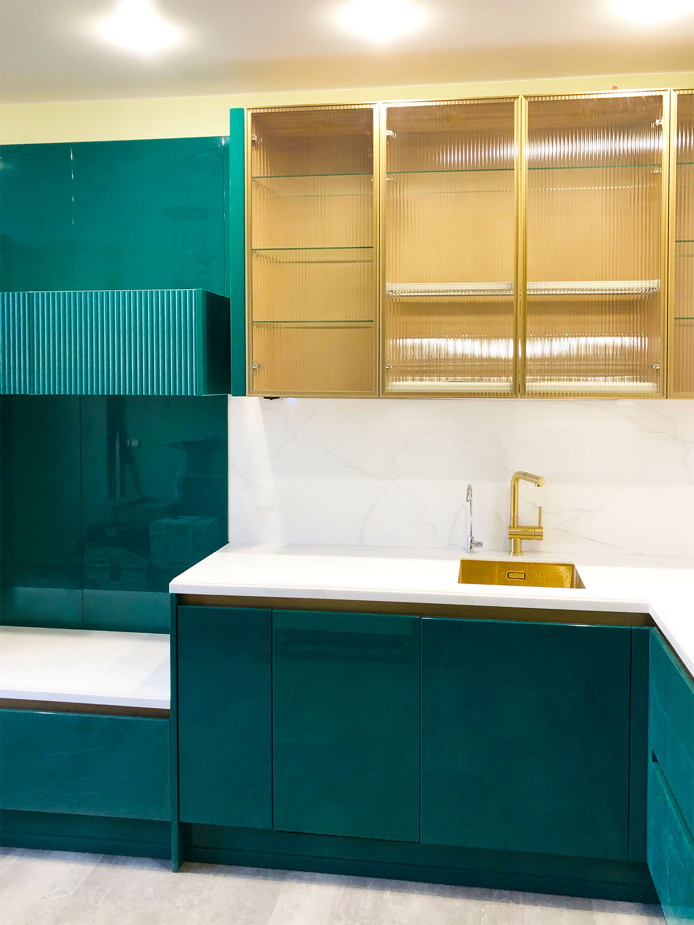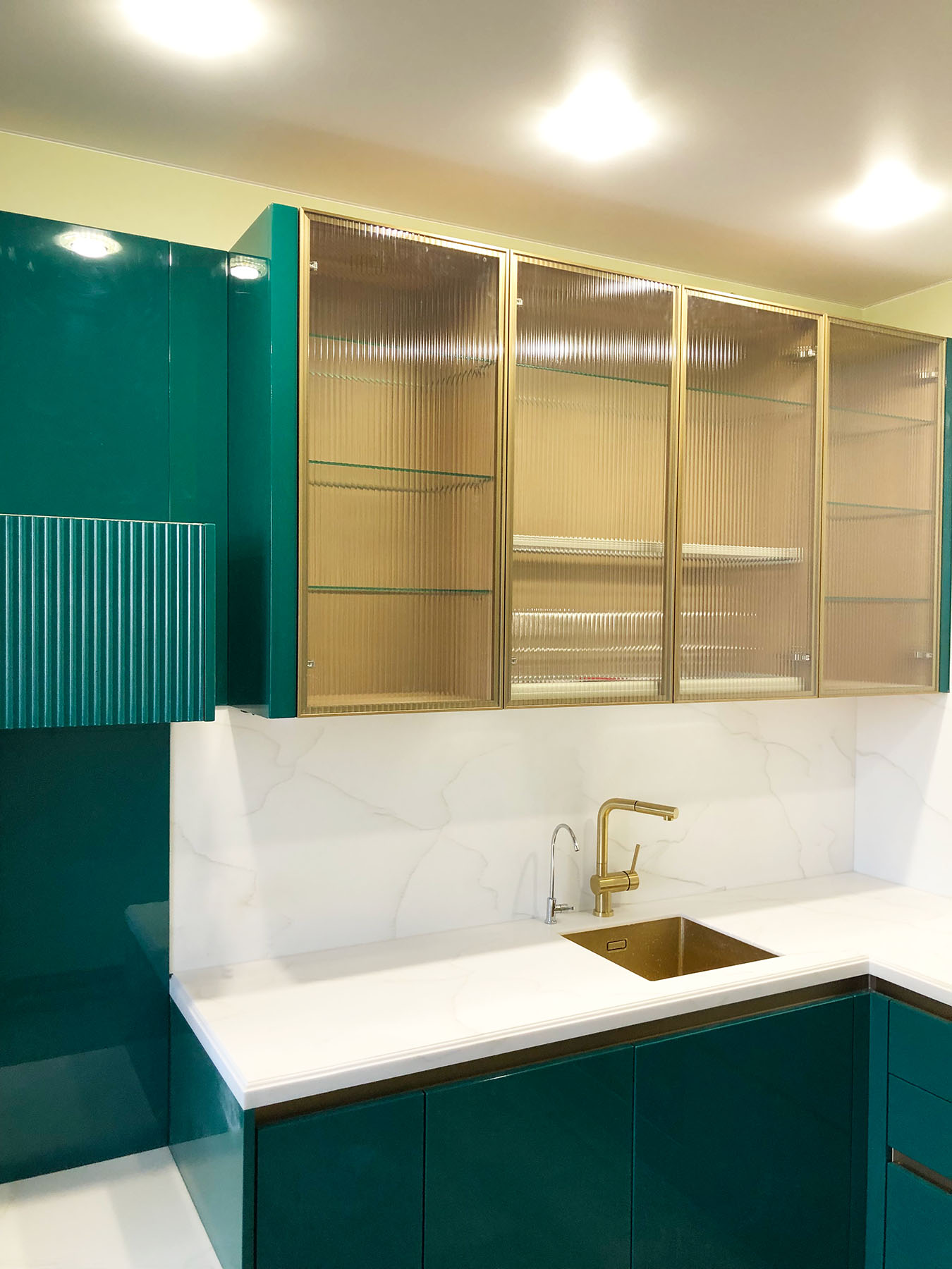 О проектеОписаниеСовременная кухня с глянцевой эмалью и золотыми деталями идеально вписалась в интерьер клиента, создавая стильное и элегантное пространство.