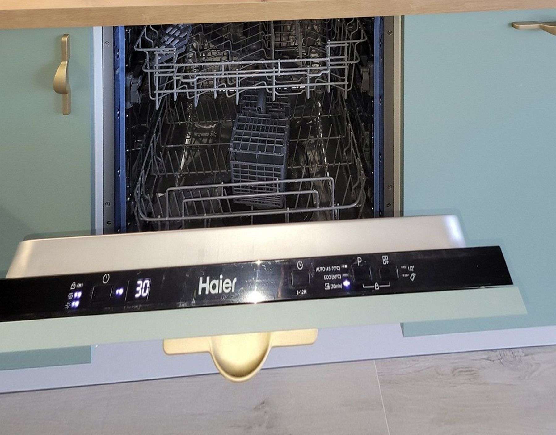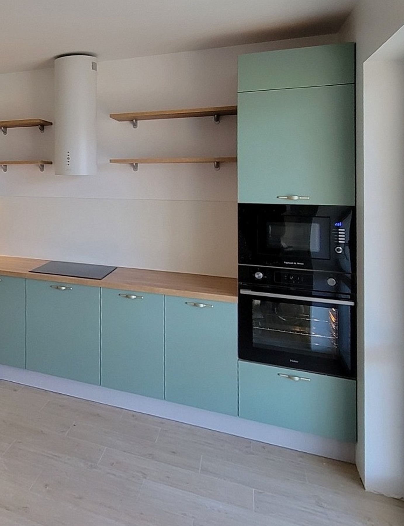 Наше решение – кухня в умиротворяющем мятном цвете фасадов. Теплота натурального дерева в отделке и столешнице создает ощущение слияния с природой. Лаконичный дизайн встроенной техники поддерживает чистоту линий, а изюминку интерьеру придают стильные золотистые акценты в виде ручек и смесителя.