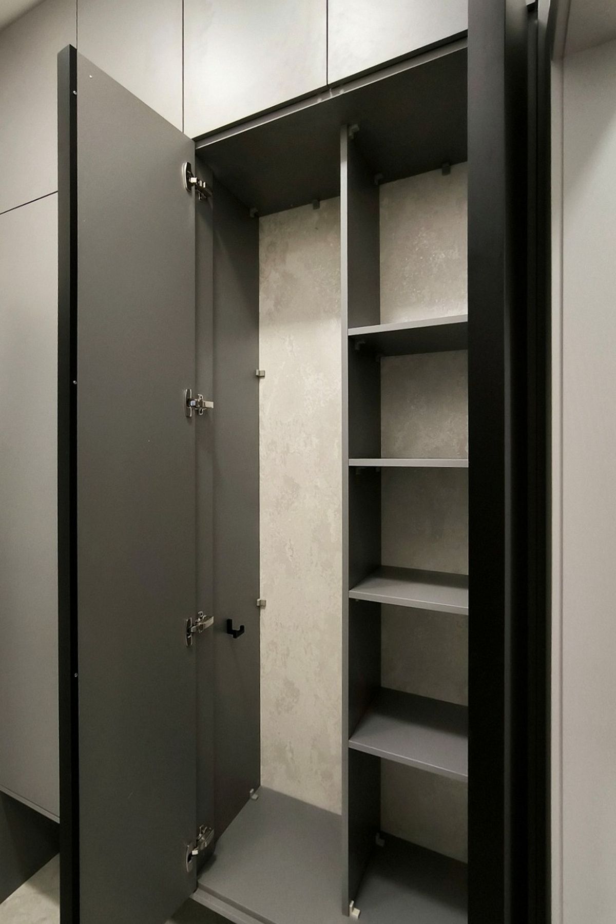 Ниша внизу предназначена для установки станции робота-пылесоса. Это позволяет технике заряжаться в скрытом и удобном месте, сохраняя провода и сам гаджет вне поля зрения. Благодаря этому решению шкаф визуально парит, создавая эффект легкости. Фасады, выполненные до самого потолка, делают конструкцию монолитной, а также значительно увеличивают полезный объем для хранения одежды, обуви и аксессуаров.