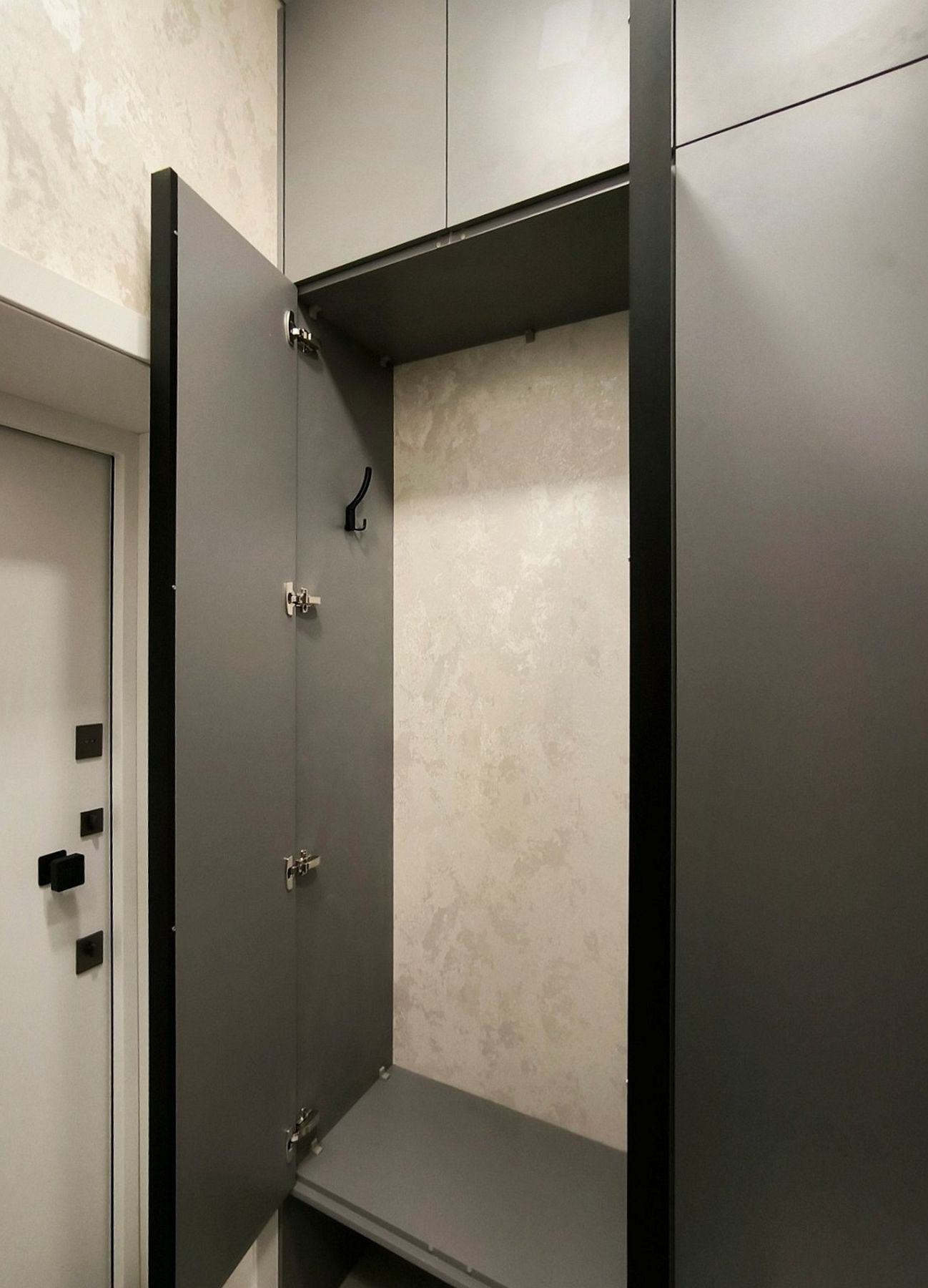 О проектеОписаниеЭтот проект решает сразу две задачи для современной прихожей: организовать максимум хранения и интегрировать умную технику, не загромождая пространство. Нашим решением стал стильный шкаф в прихожую с нижней нишей.