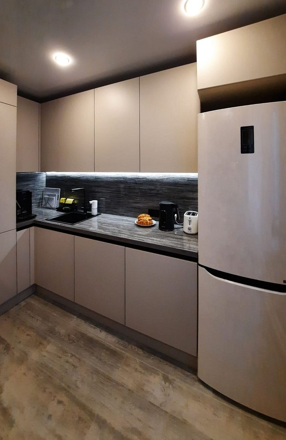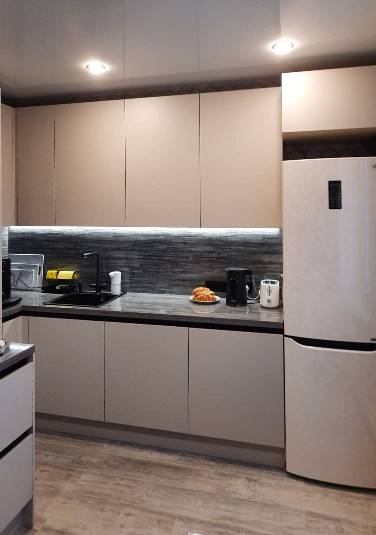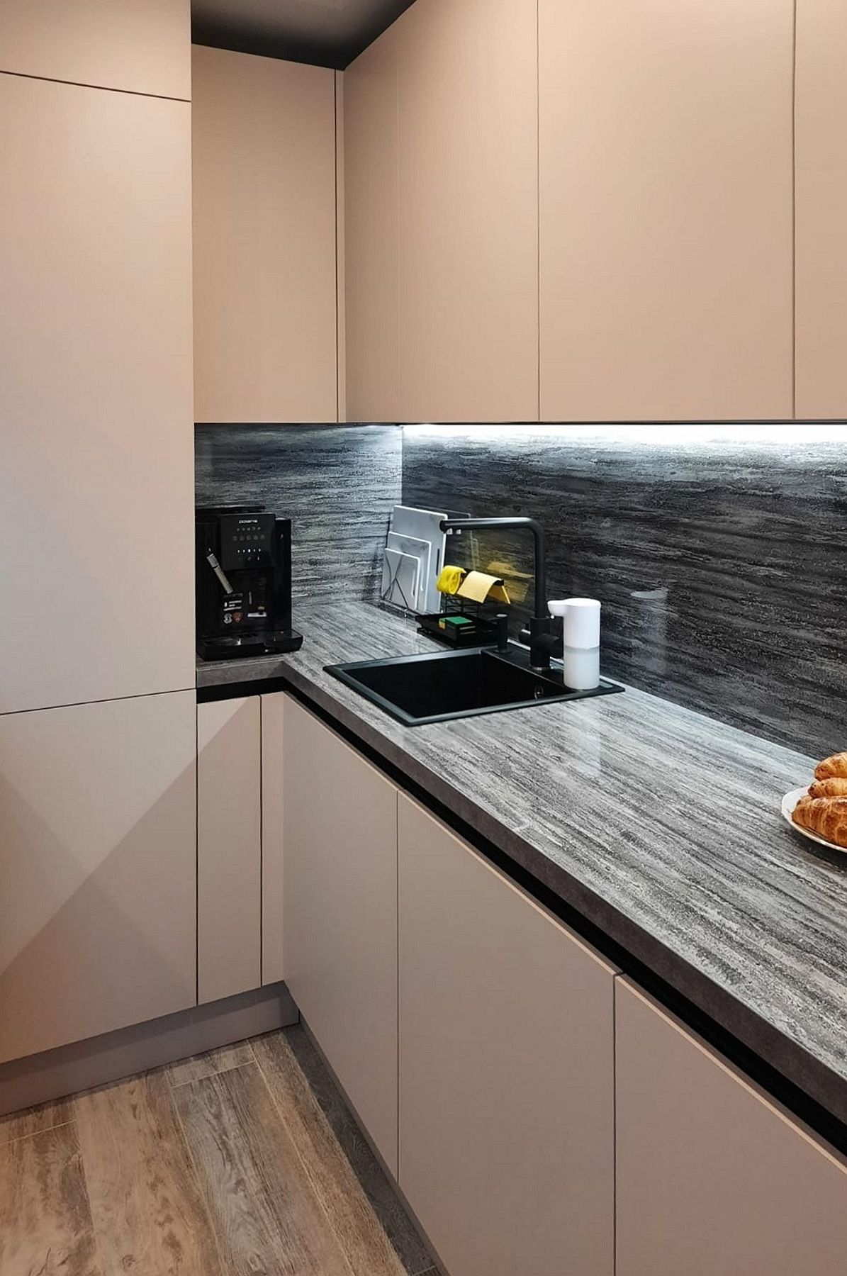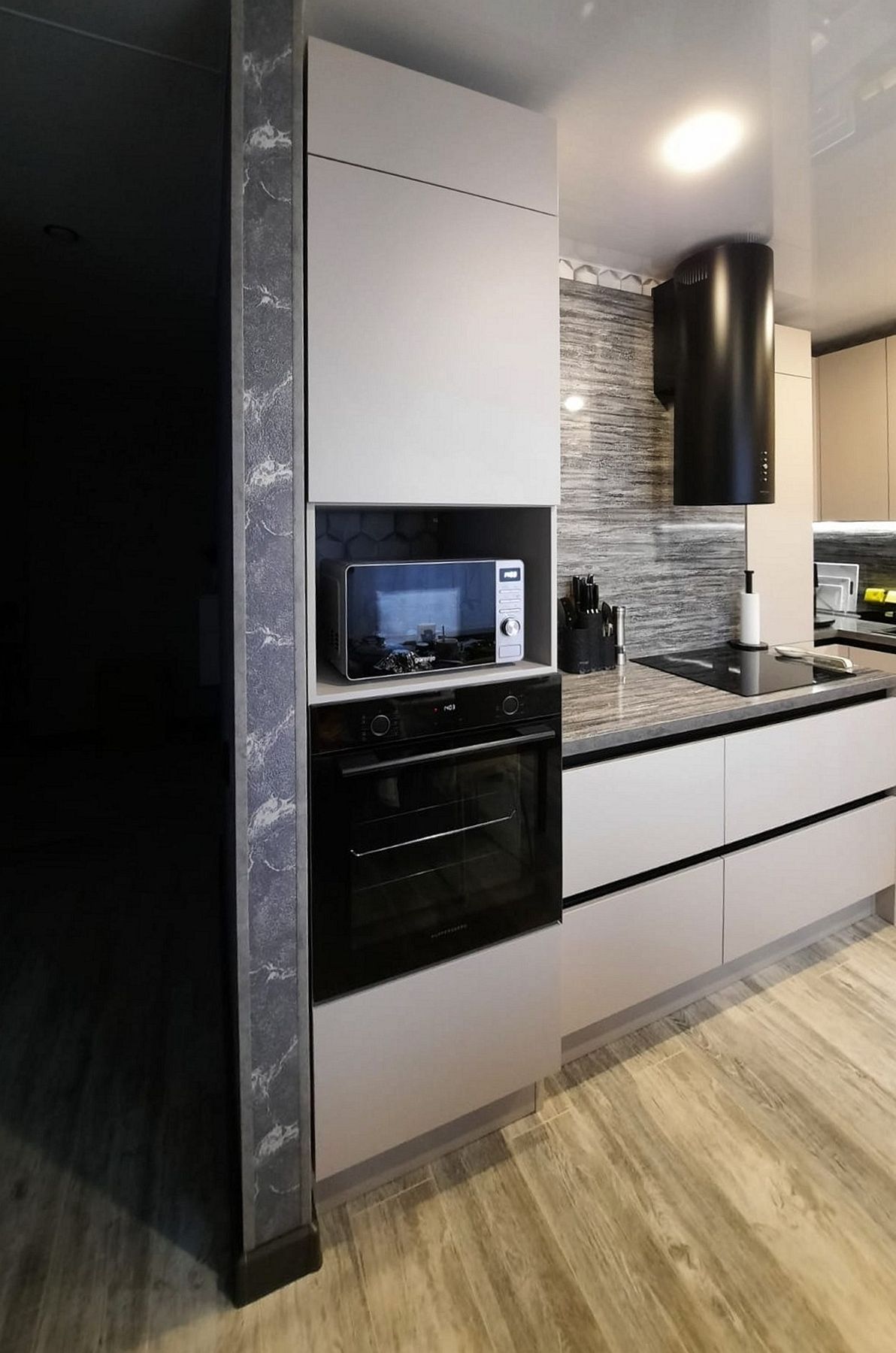 Мы разработали конструкцию, которая маскирует все коммуникации, превращая проблемную зону в часть эргономичного дизайна. Особый шарм помещению придают глянцевые поверхности: столешница и стеновая панель отражают свет, делая интерьер современным и легким.