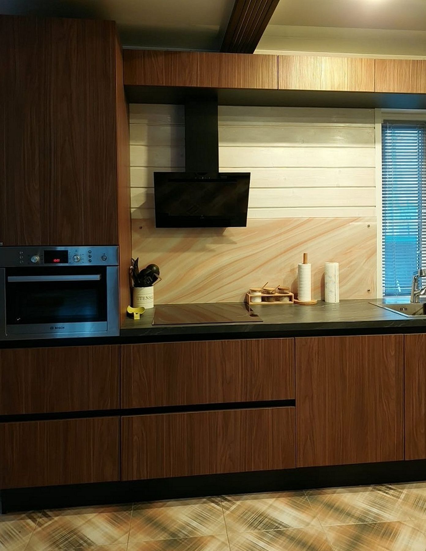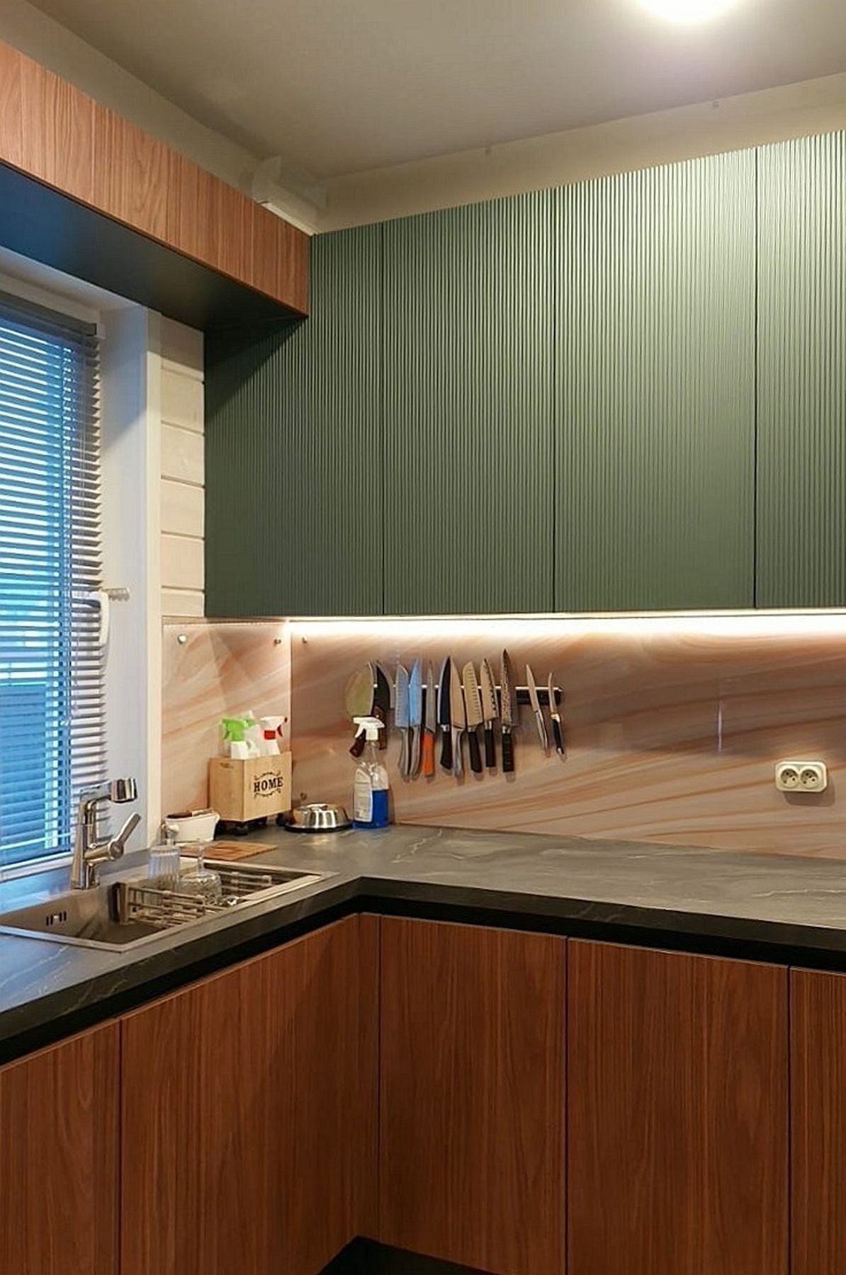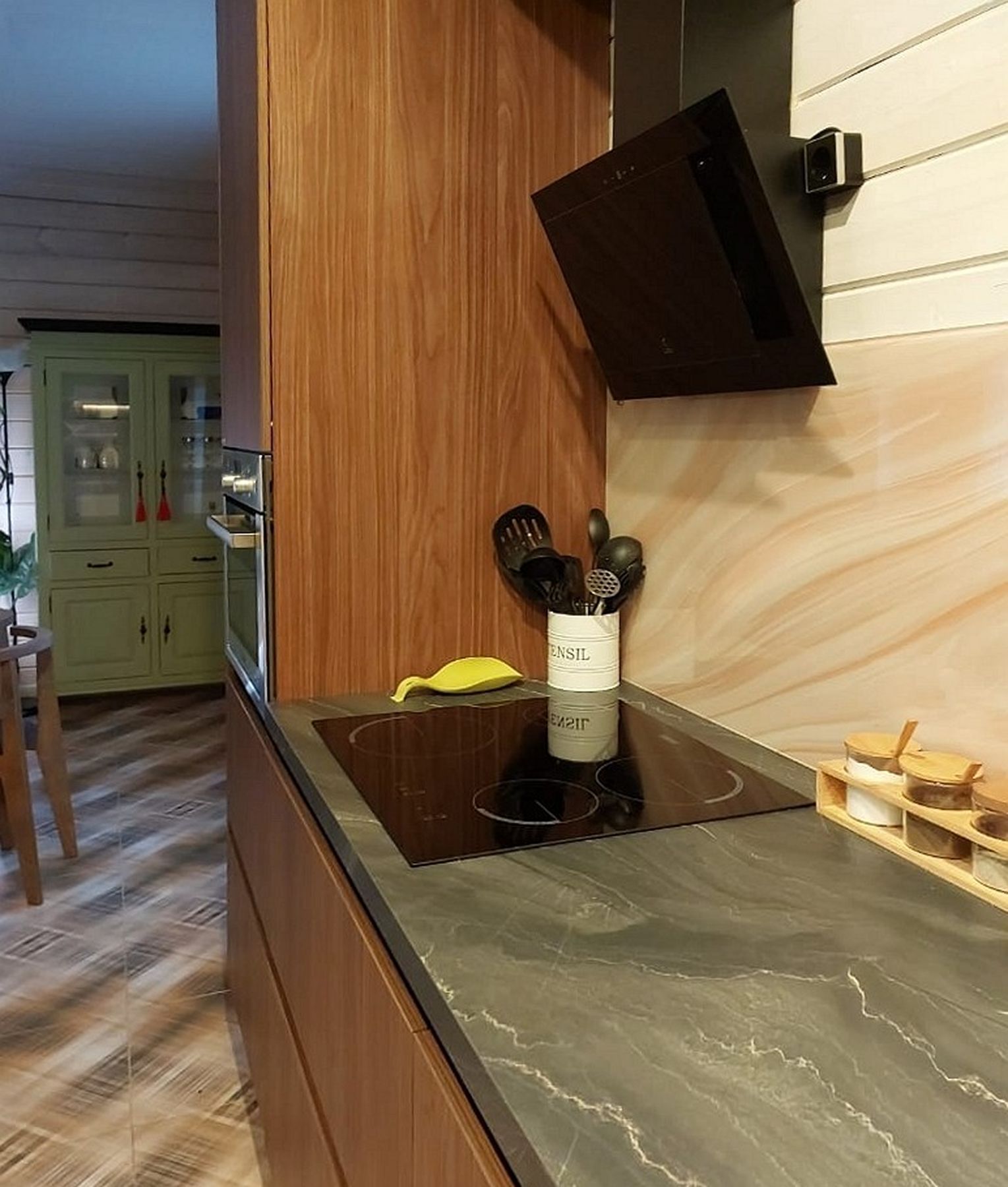 О проектеОписаниеЭта кухня для загородного дома создает особую атмосферу – уютную и тесно связанную с природой. В основе дизайна лежит гармоничное сочетание натуральных оттенков: теплого "ореха линкольн" для одних фасадов и глубокого зеленого цвета для других. Контрастные черные акценты вносят в этот природный колорит современную графичность и четкость.