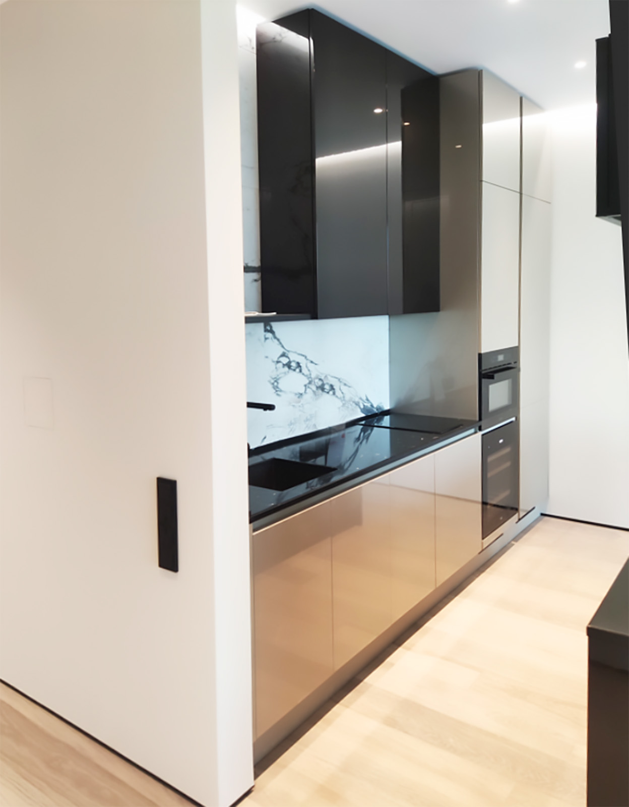 Параллельная планировка кухни позволяет расширить рабочую поверхность, а также сделать универсальным сам гарнитур: здесь можно не только готовить, но и отлично проводить время с друзьями!
