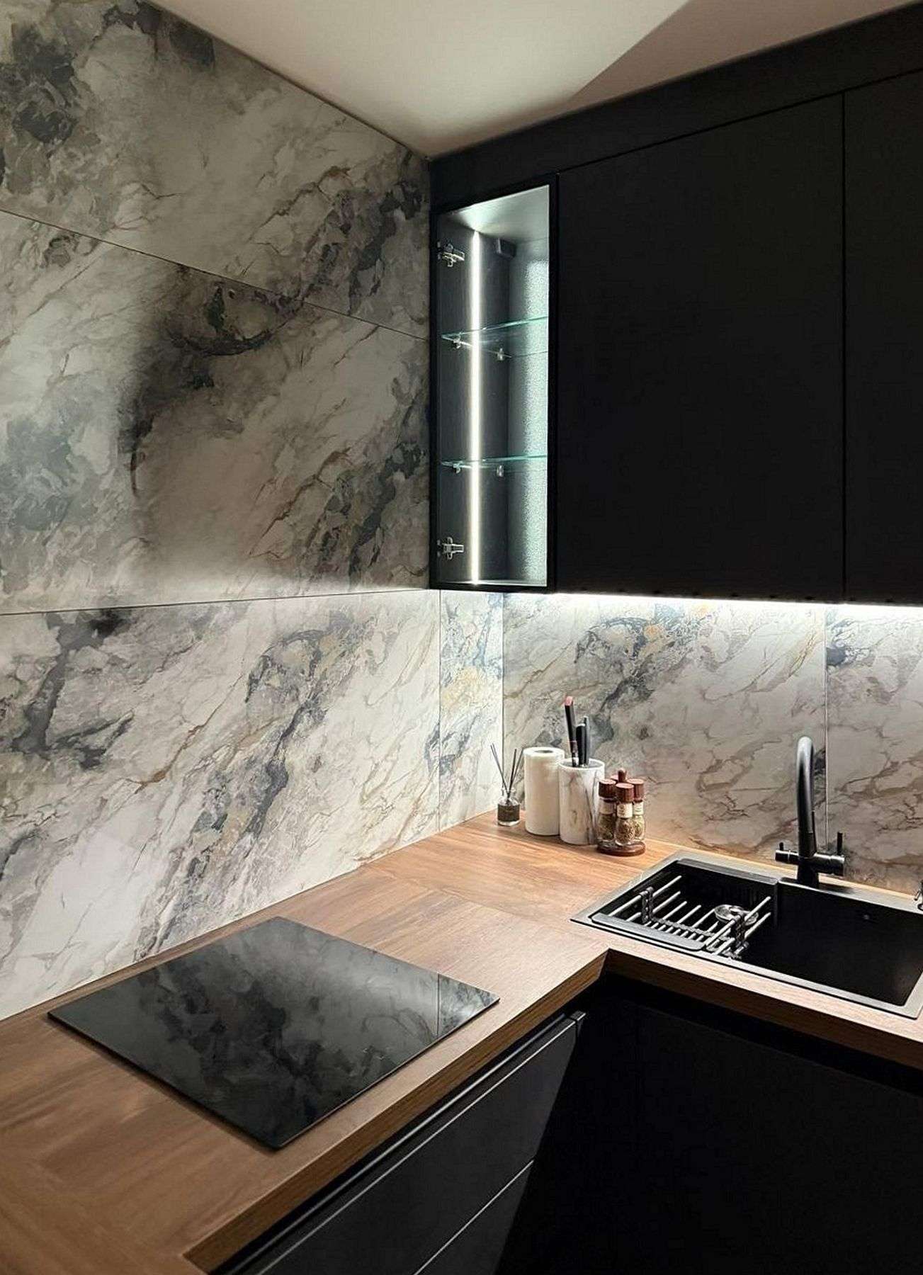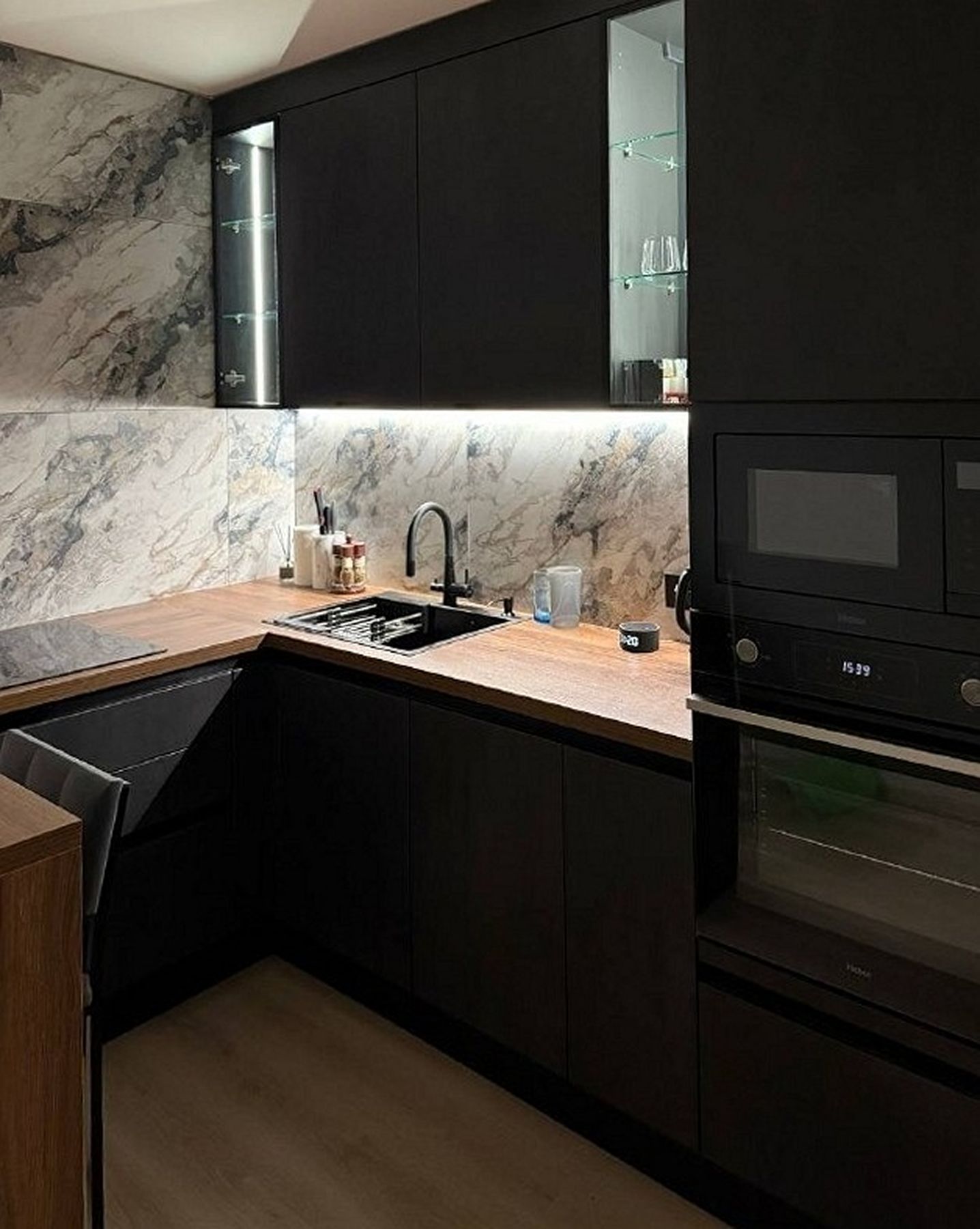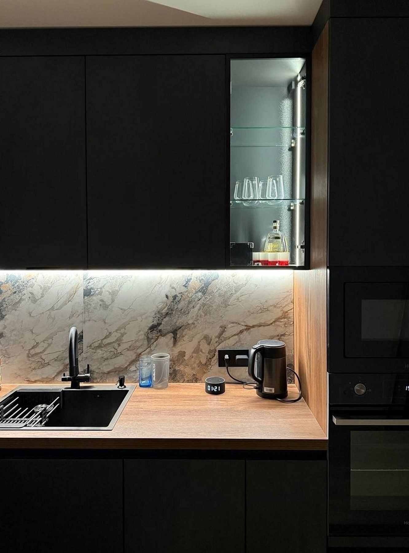 О проектеОписаниеЭтот проект демонстрирует, как кухня в темных тонах может быть не только стильной, но и по-настоящему многофункциональной. Ключевой задачей было создать элегантное и современное пространство, где готовка плавно перетекает в общение. Решением стала П-образная кухня с барной стойкой, которая стала композиционным центром помещения.