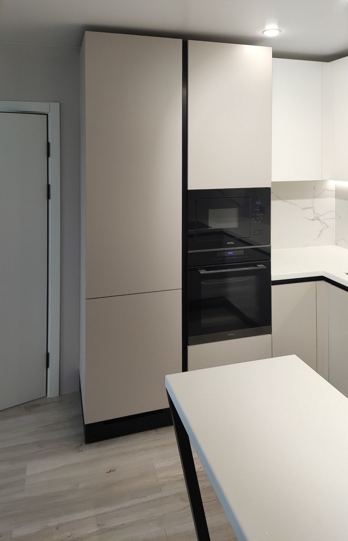 Цвета гарнитура "кашемир" и "белый премиум" идеально вписались в интерьер помещения. Черные техника и сантехника добавили необходимого контраста, а система освещения обеспечила комфорт при готовке в вечернее время.