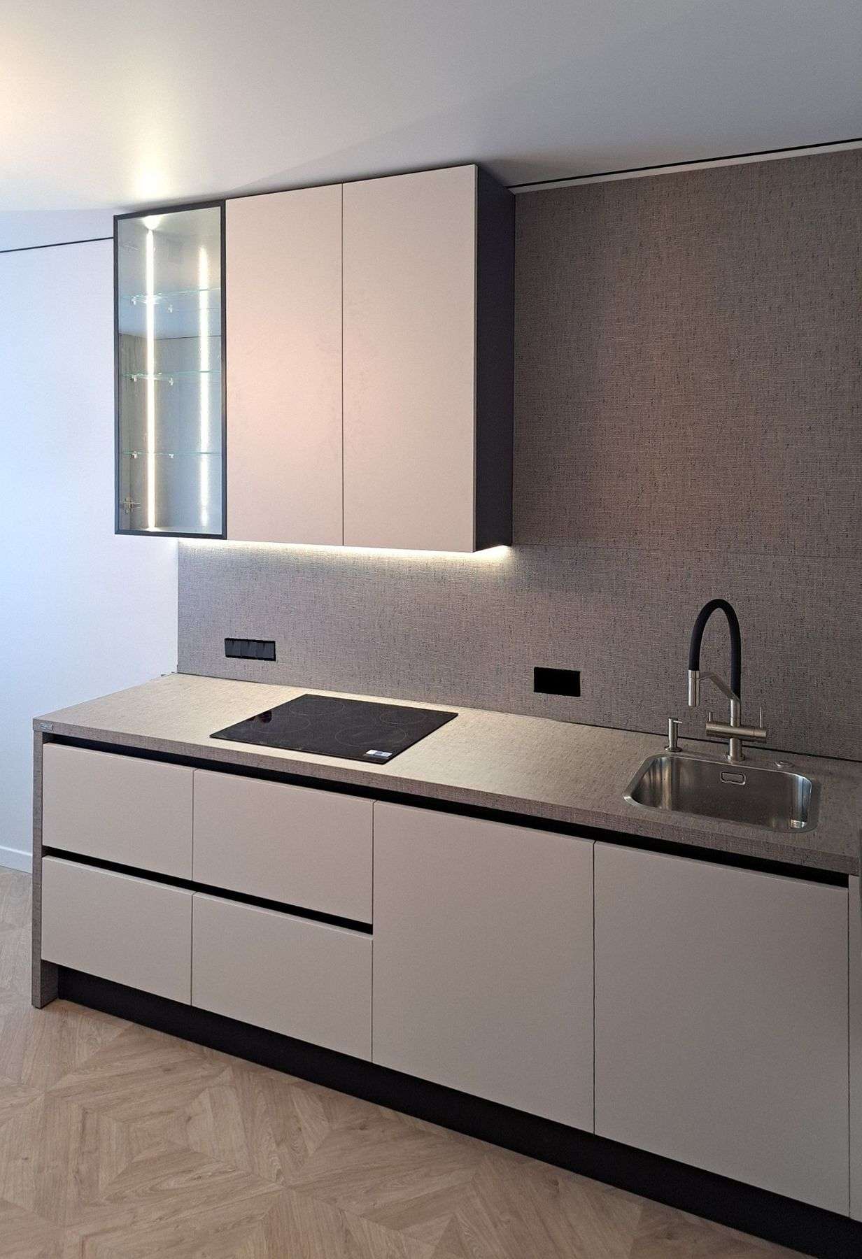 Лаконичный образ построен на контрасте: фасады цвета "кашемир" сочетаются с выразительным темным цоколем. Витринный модуль с подсветкой добавляет интерьеру легкости и динамики. Основные зоны размещены по правилу «рабочего треугольника». Вся техника скрыта за фасадами, поддерживая лаконичный дизайн.