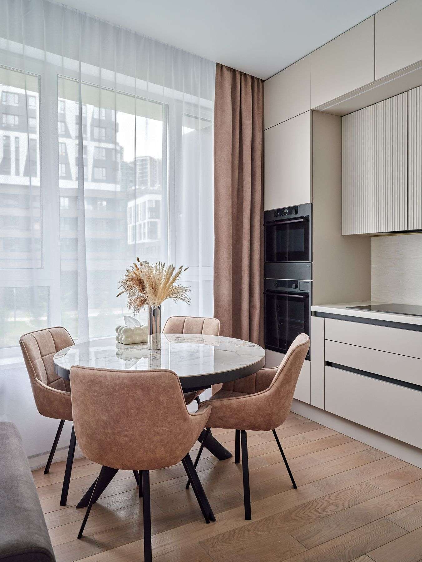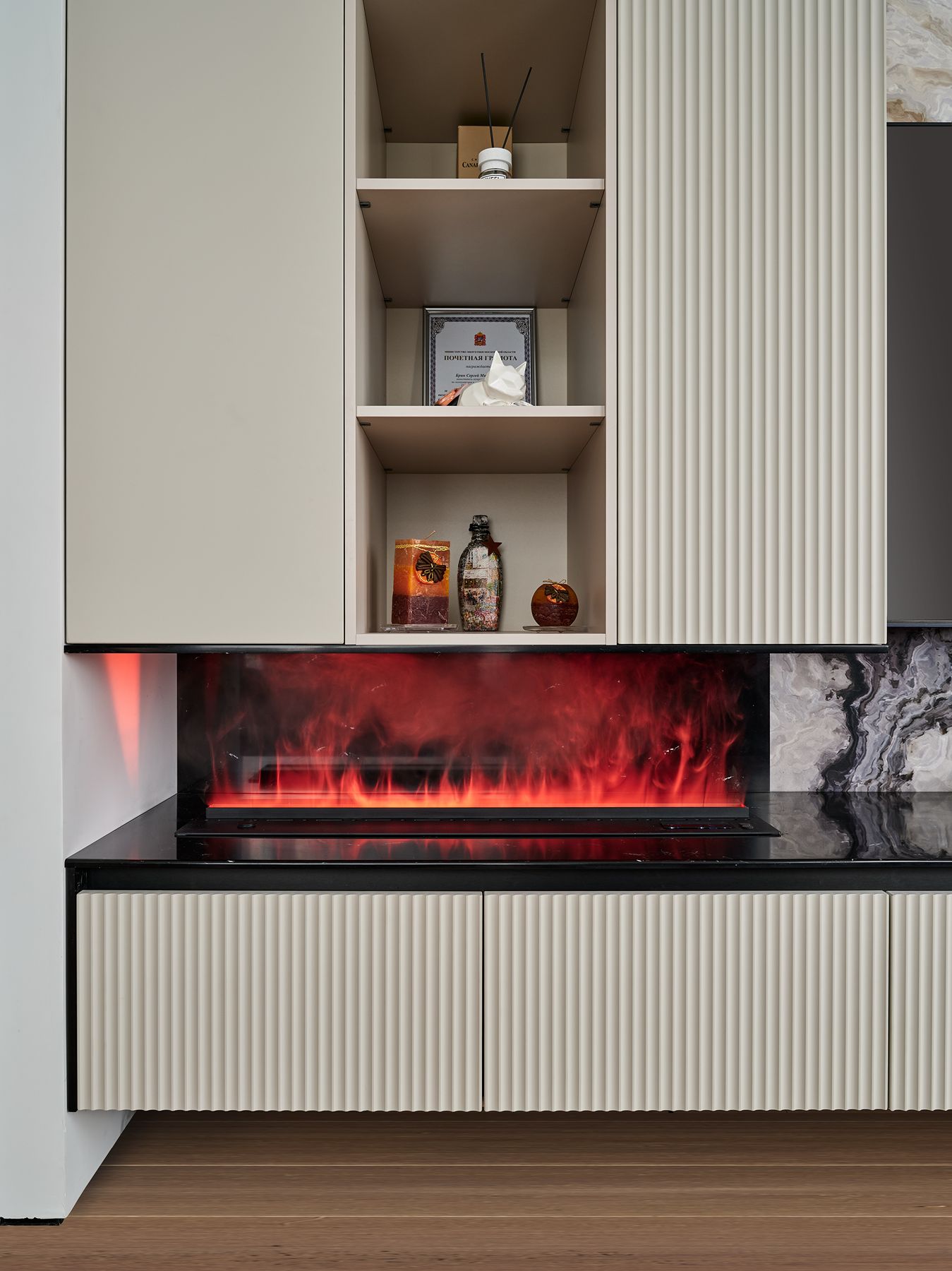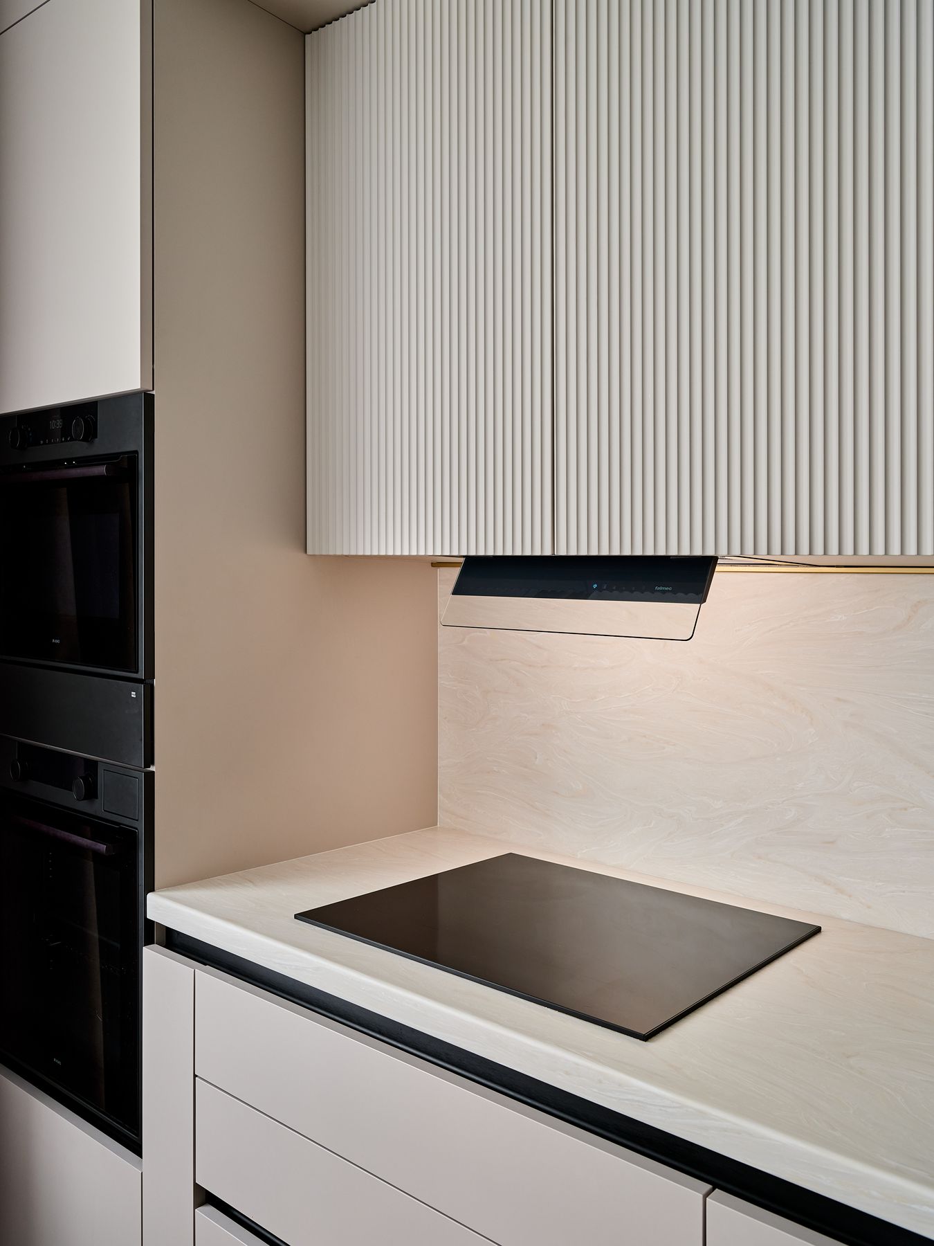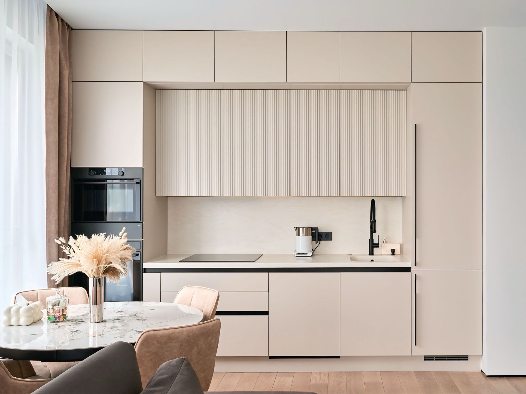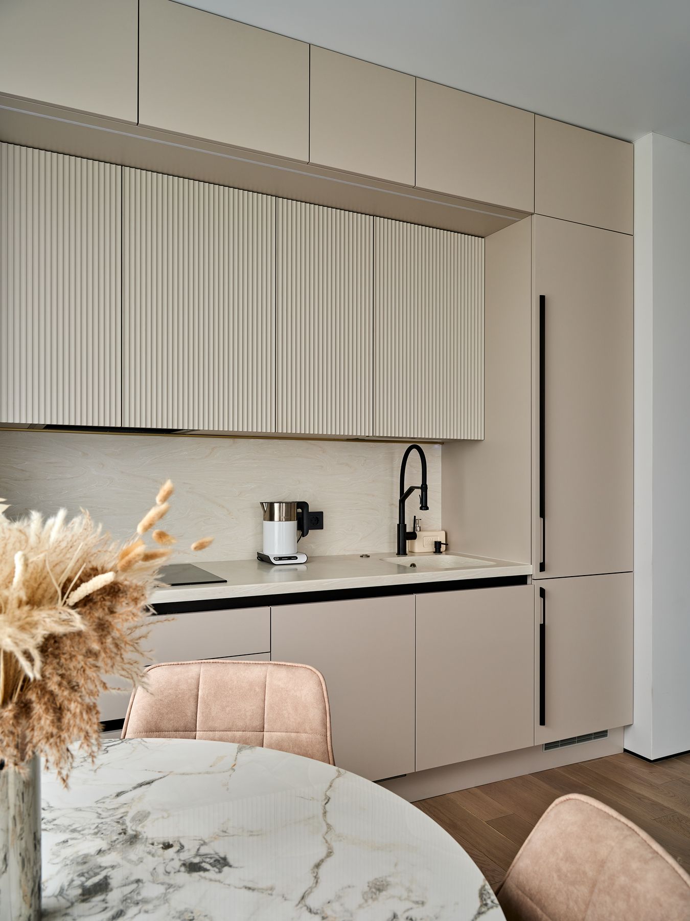 Основой проекта стала кухня в теплом оттенке «кашемир». Мы использовали практичные прямые фасады Mix 22 в сочетании с трендовыми рифлеными фасадами Teramo. Столешница и фартук из искусственного камня обеспечили эстетичный и неприхотливый в уходе вариант. Сложность заключалась в необычной планировке помещения, поэтому мебель была спроектирована с ювелирной точностью. В гостиной зоне легкая консоль под ТВ с открытыми полками и встроенным биокамином создает уютный акцент, продолжая общую эстетику.