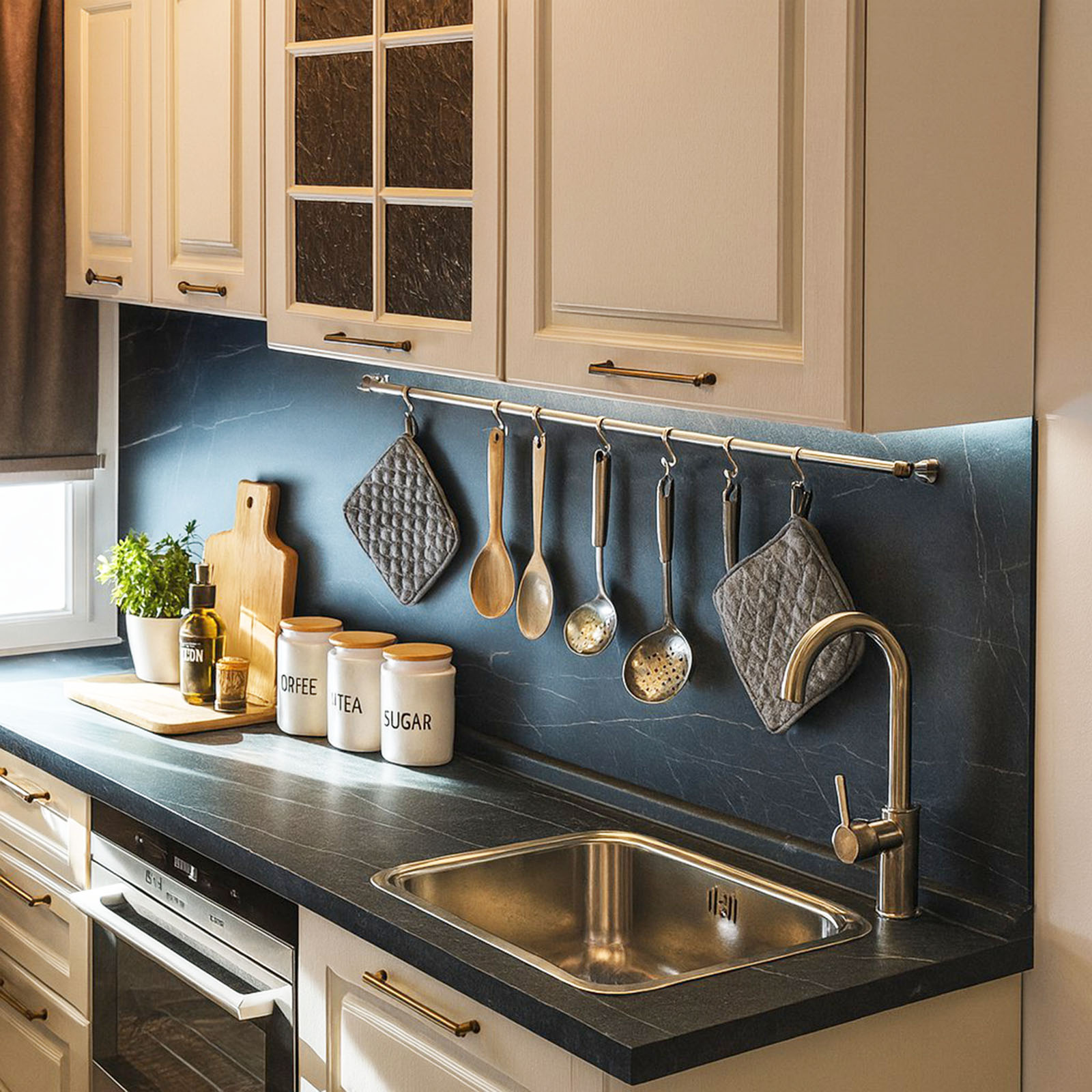 Эта кухня объединяет эстетическую привлекательность и практичность в небольшом пространстве.