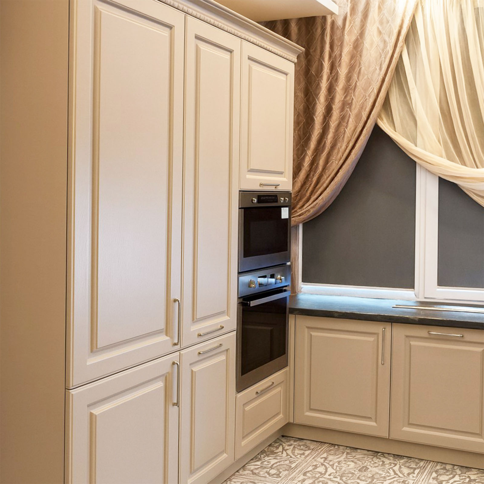 Фасады мебели выполнены в рамочной форме, имеют матовую поверхность с легкой текстурой дерева, что добавляет тепла и уюта в интерьер. Рабочая поверхность и фартук украшены темным камнем, создающим стильный контраст и обеспечивающим высокую практичность. Такой цветовой и материальный контраст делает кухню более выразительной и современной.