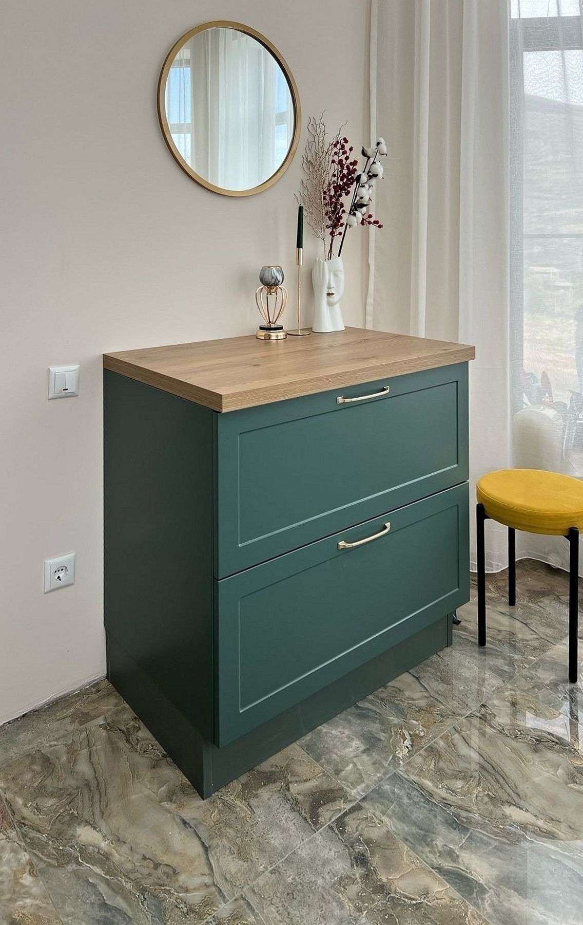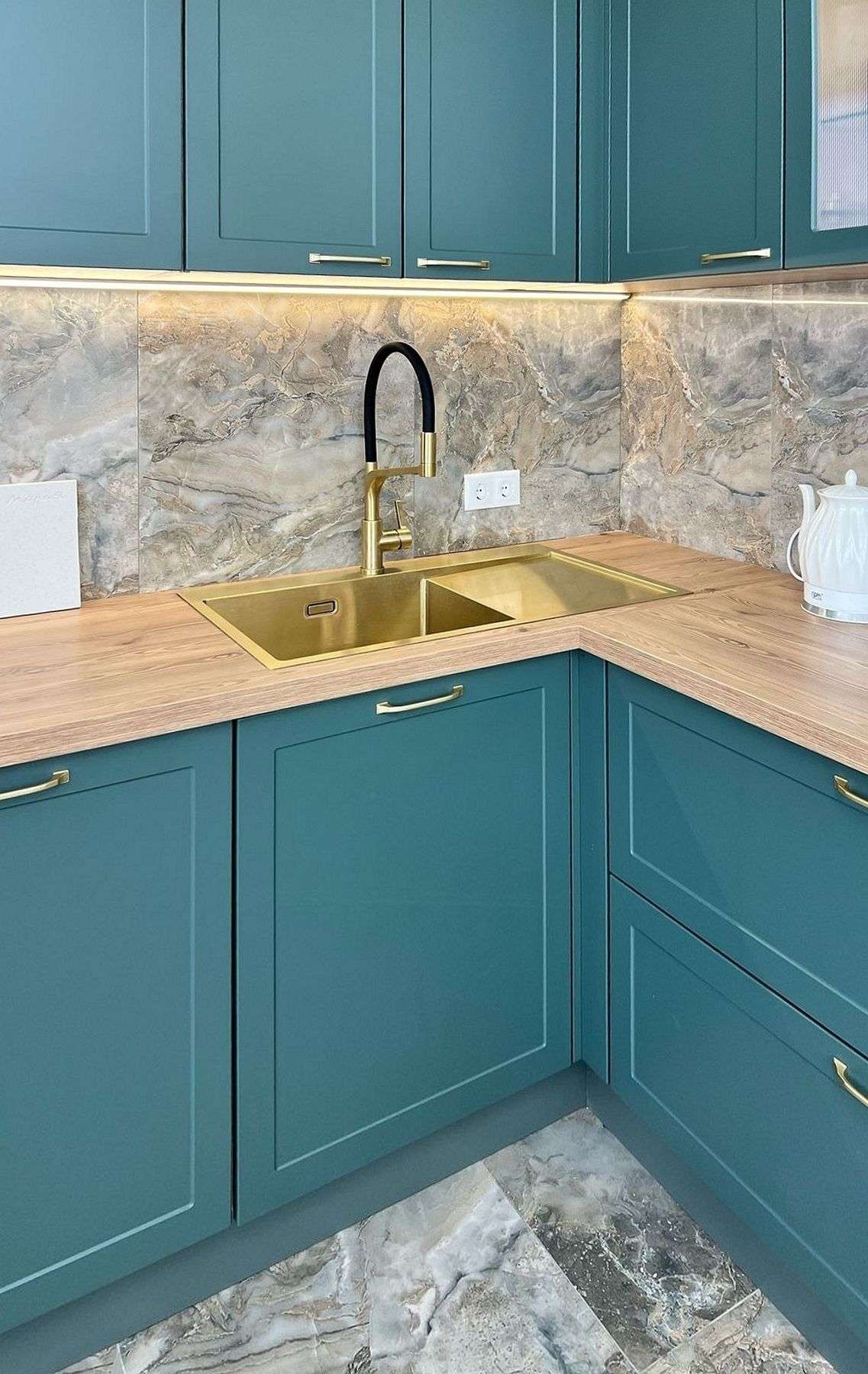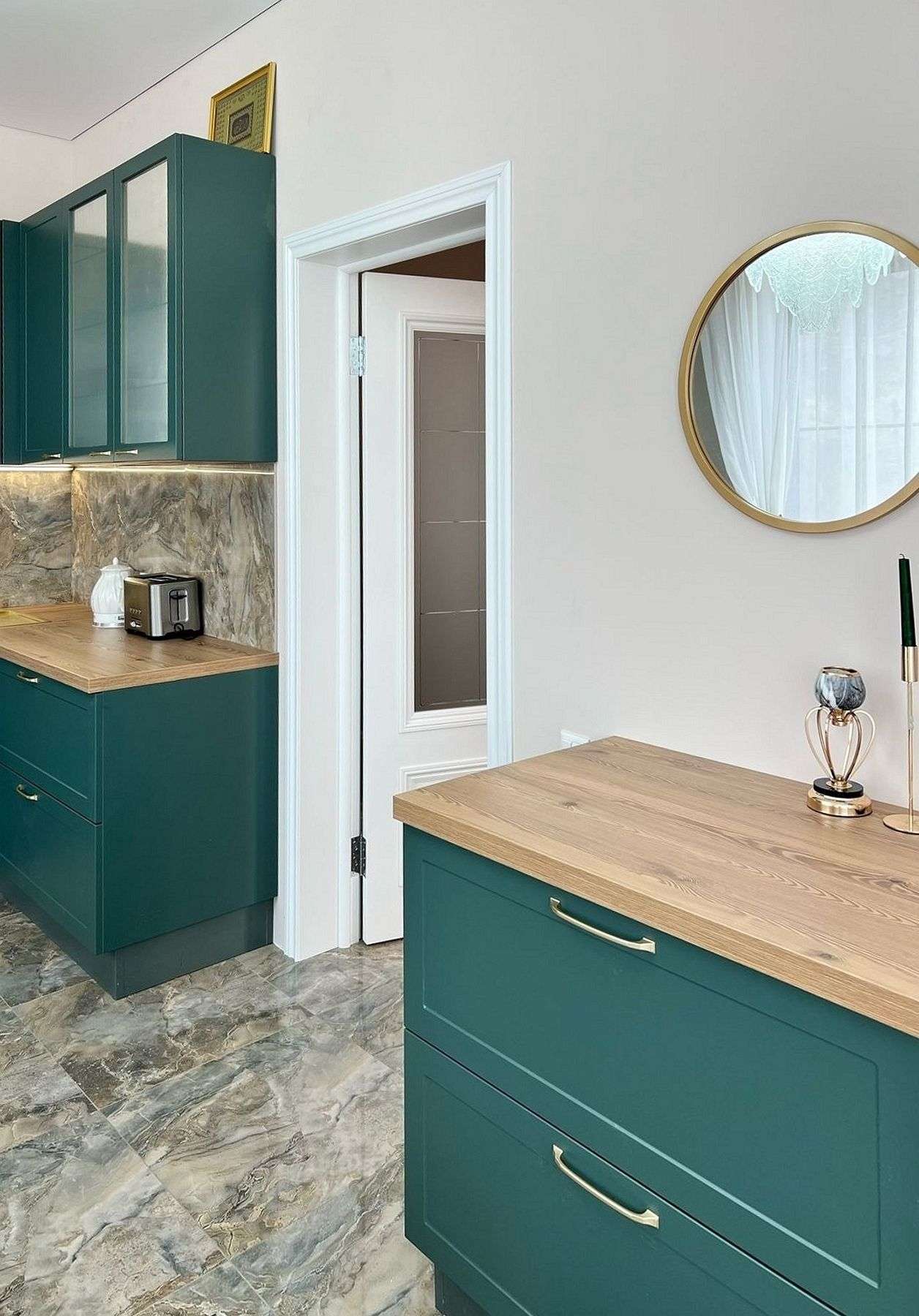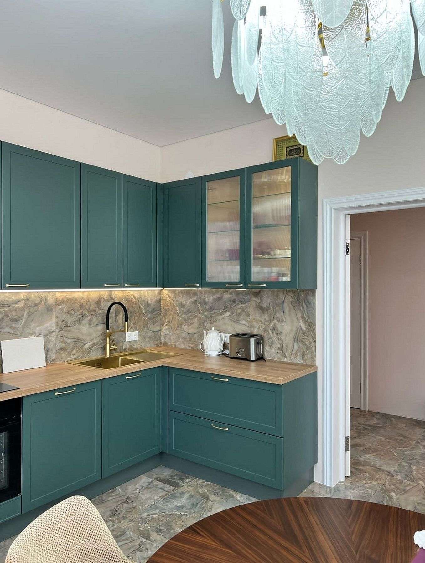 Ключевым элементом стала столешница с выразительной текстурой. Ее природный рисунок и приятная на ощупь поверхность дарят неповторимое тактильное удовольствие, связывая интерьер с образами леса и природы. Каждая деталь кухни была подобрана, чтобы пространство не просто функционировало, а вдохновляло каждый день.