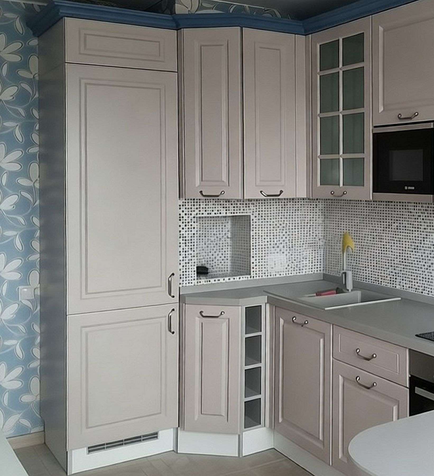 В основе – кухонный гарнитур, где классические элементы (филенчатые фасады, фурнитура под старину) сочетаются с продуманной эргономикой. Системы хранения спрятаны за изящными фасадами, обеспечивая порядок.
