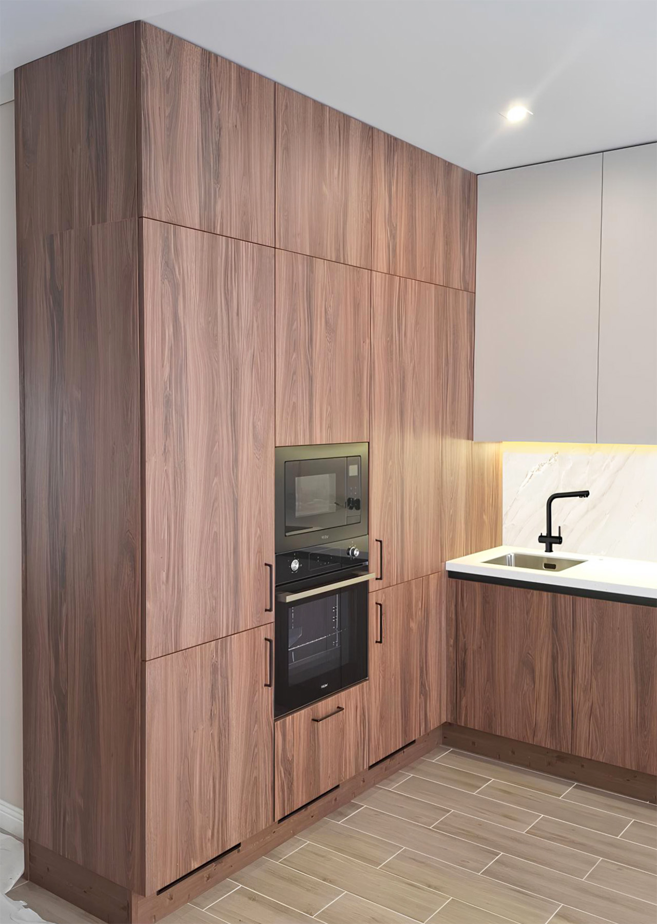 Фасады с акцентом на натуральные материалы (дуб) и светлую палитру (кашемир) создают ощущение уюта и гармонии с природой, не перегружая пространство излишними деталями.