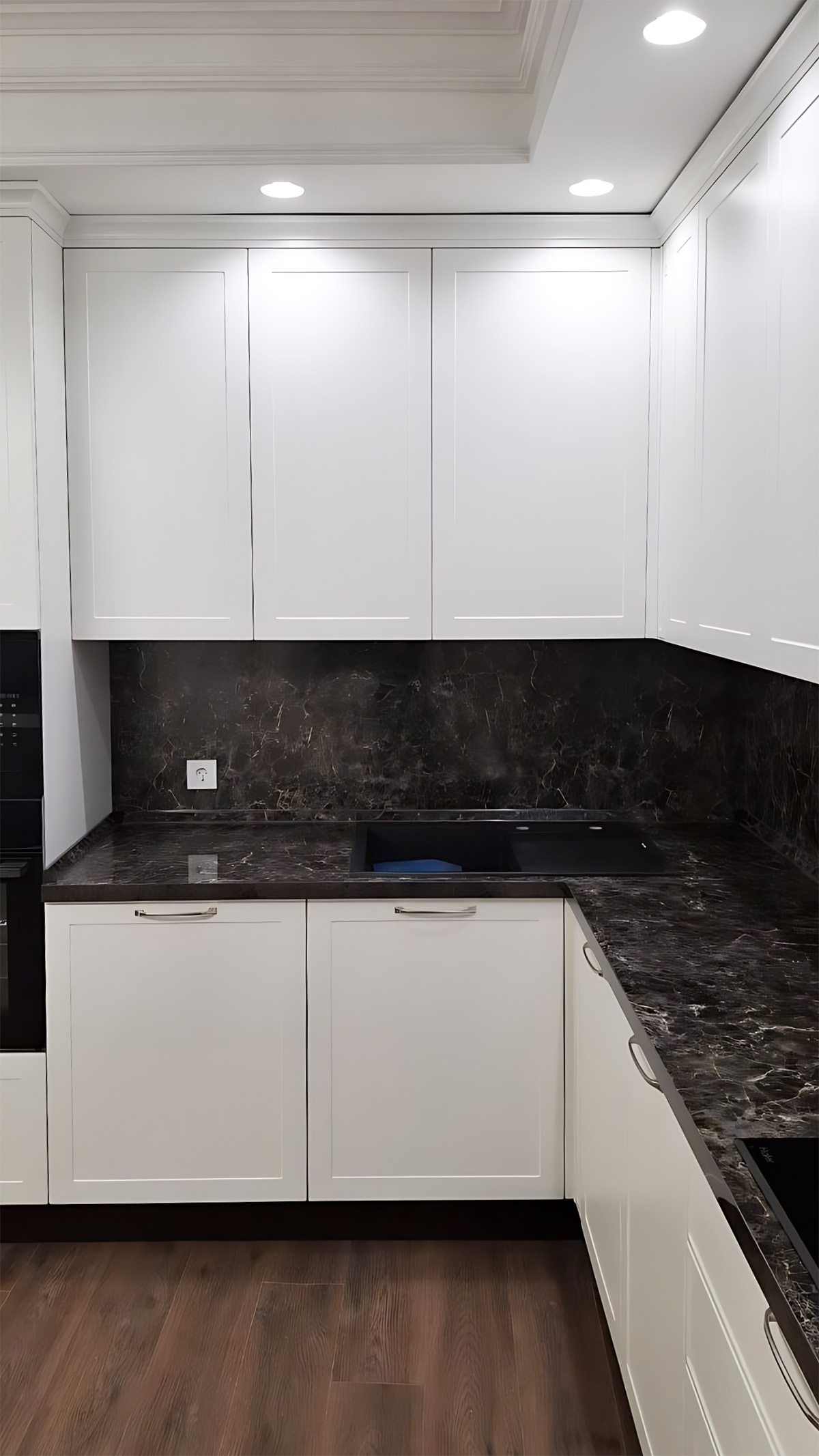 О проектеОписаниеБольшая вместительная кухня выполнена в стиле неоклассики. Она создает элегантную и гармоничную атмосферу. Цветовая гамма белого и черного делает дизайн современным и актуальным вне зависимости от модных тенденций. Такой контрастный подход подчеркивает стильность и изысканность пространства.