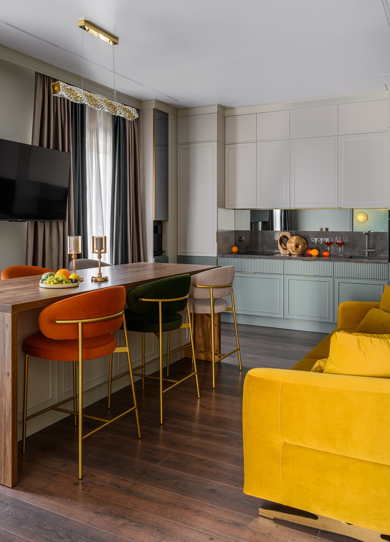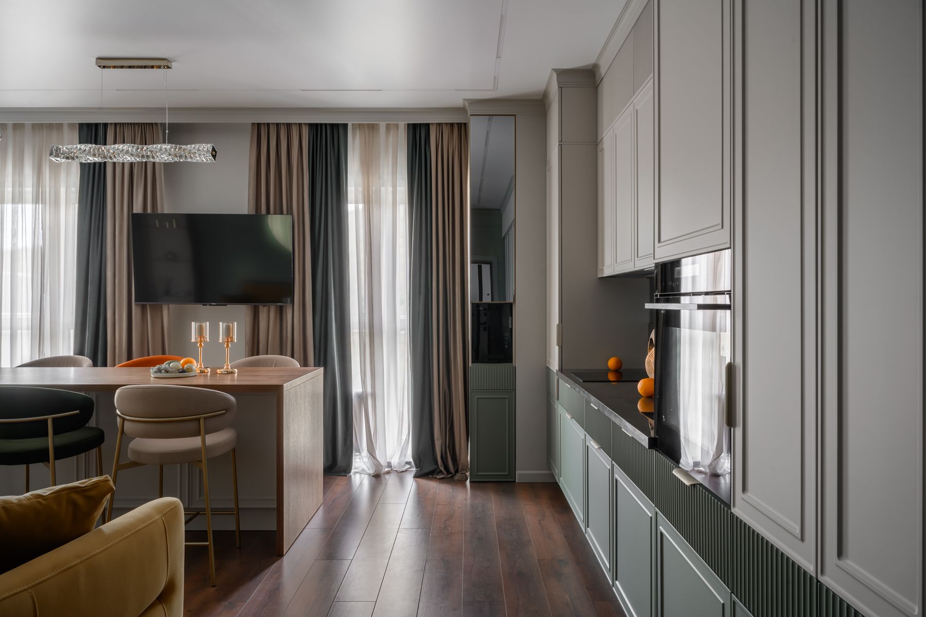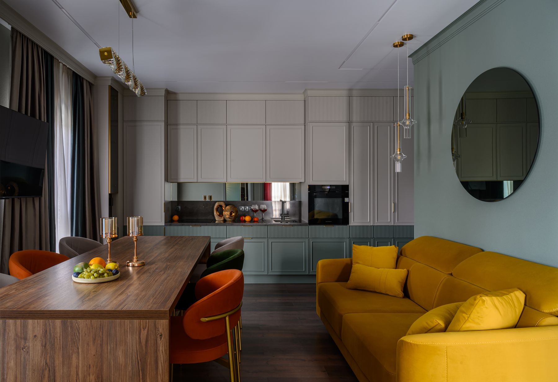 Дизайнерская кухня-гостиная с островом и вместительными шкафами