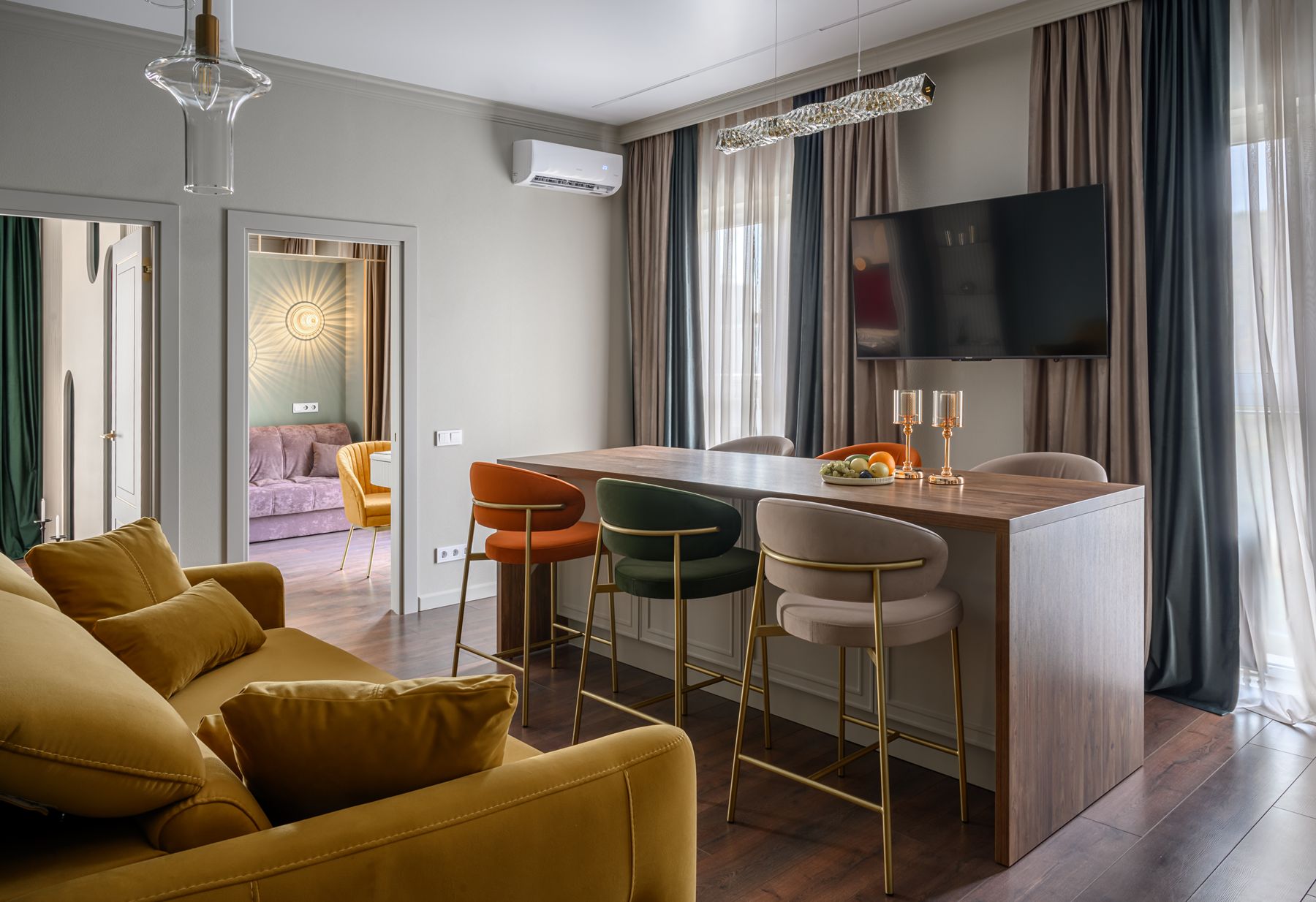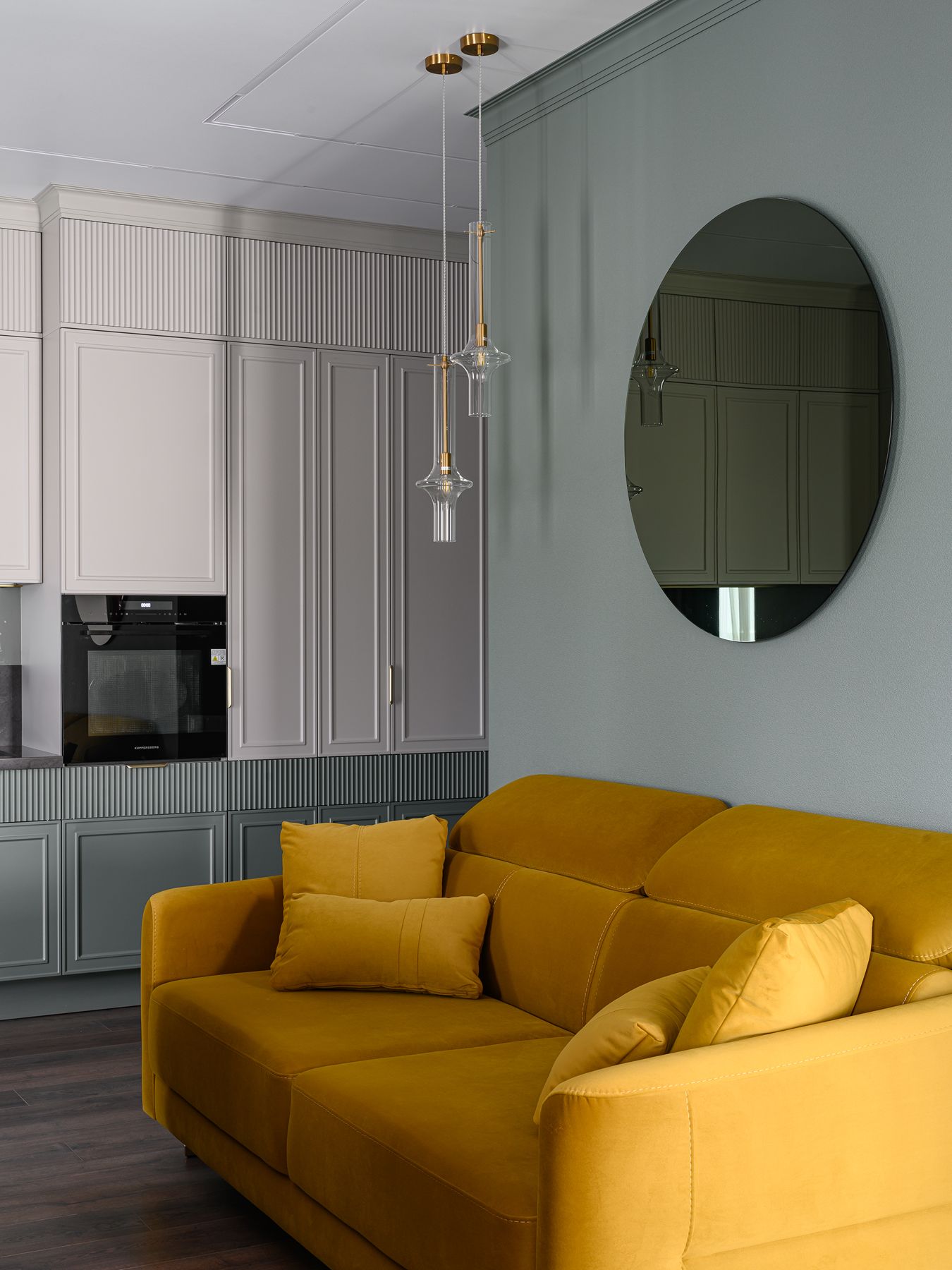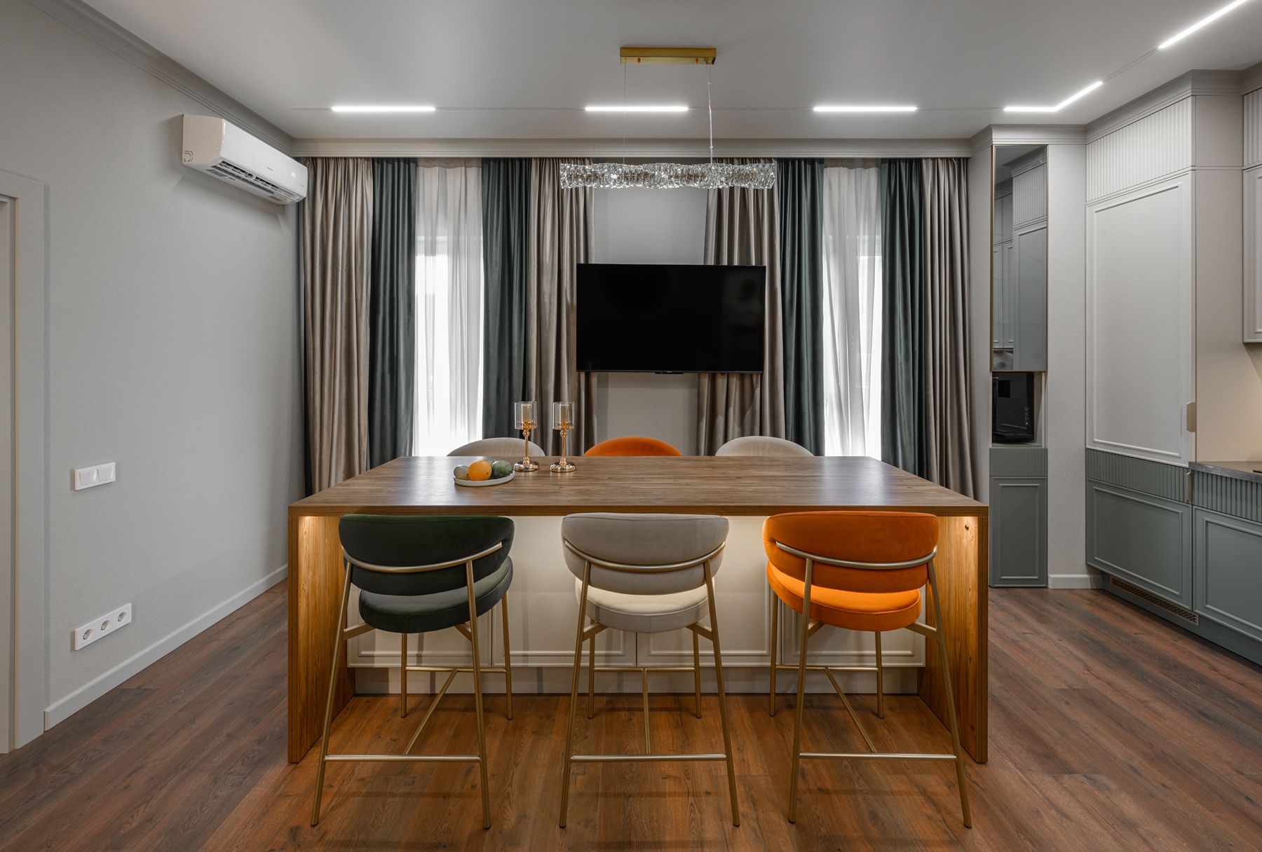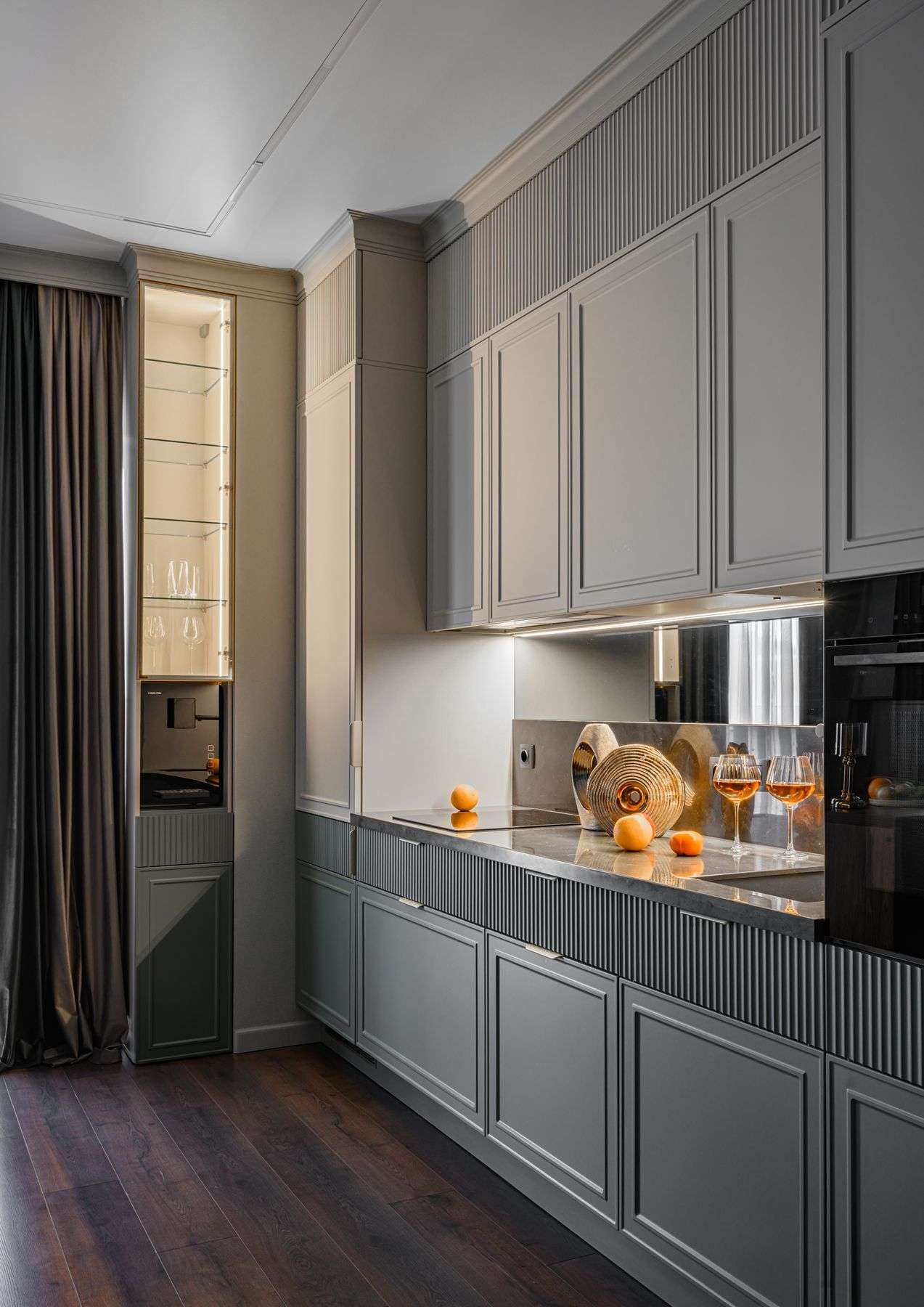 Дизайнерская кухня-гостиная с островом и вместительными шкафами