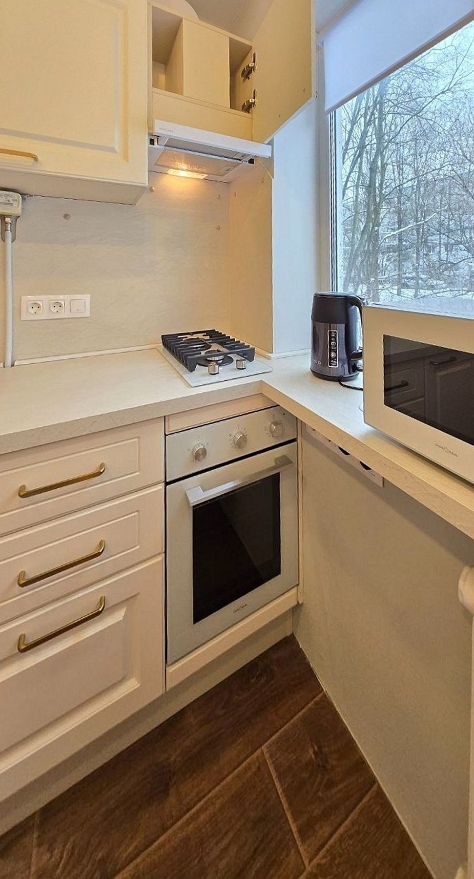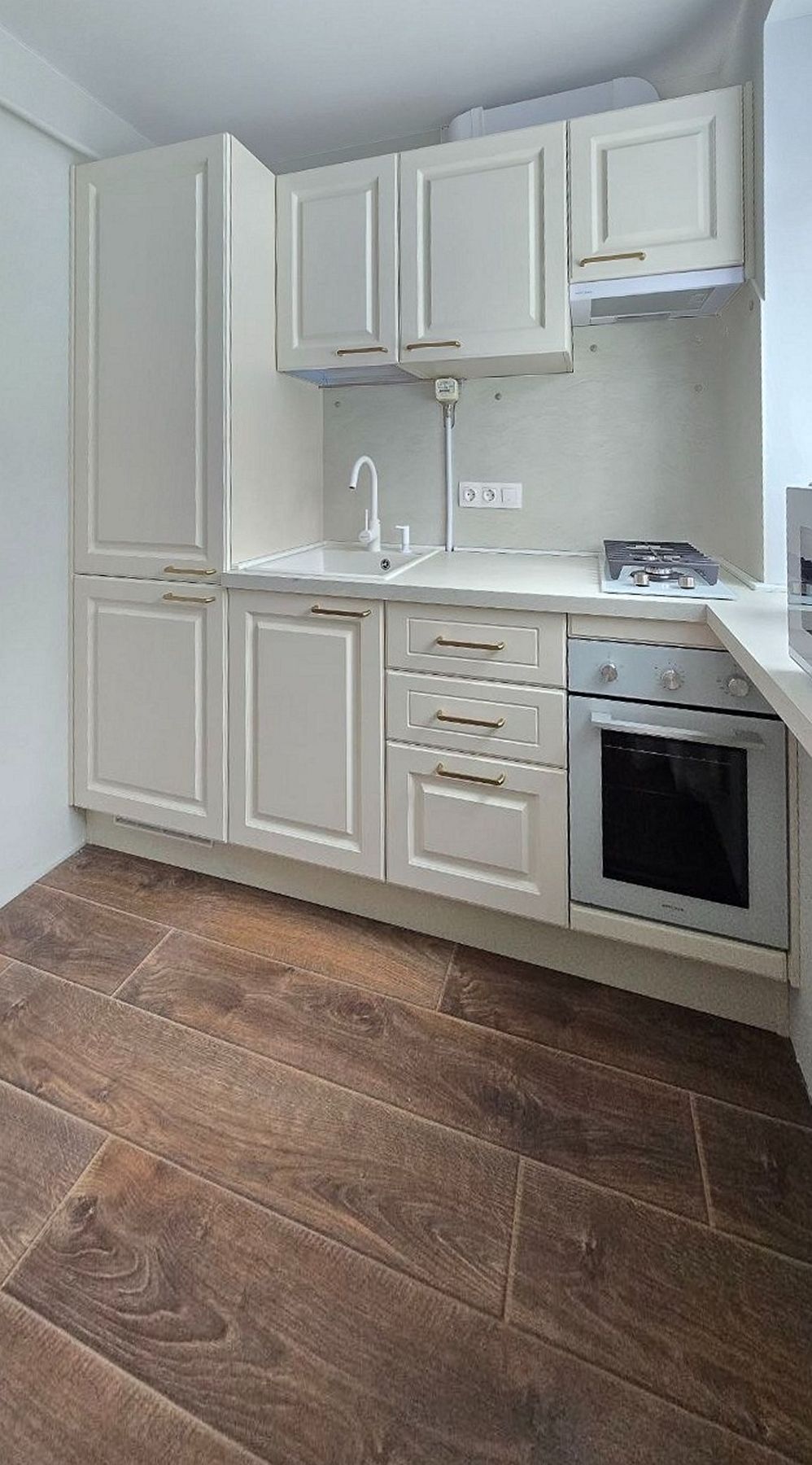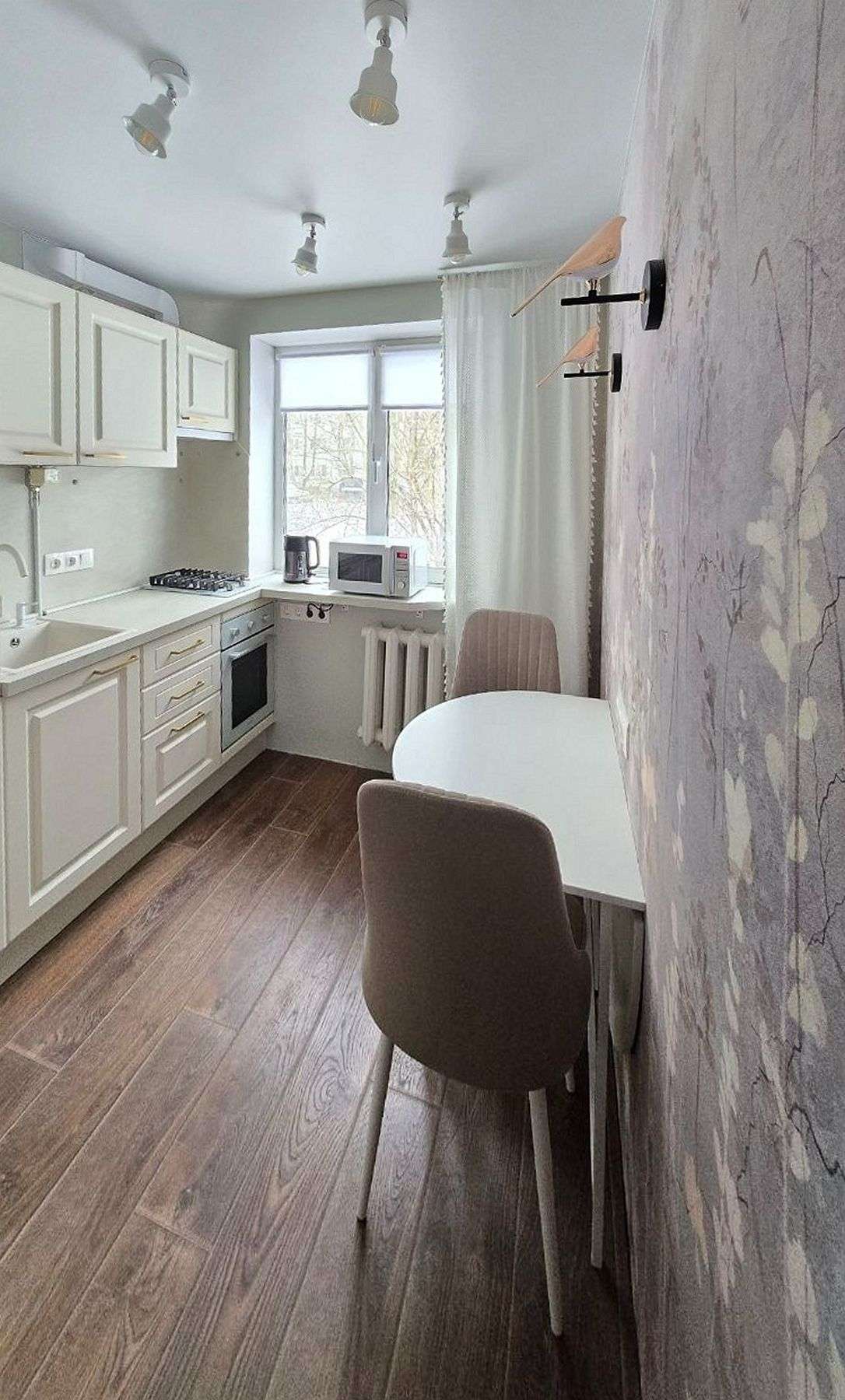Мы спроектировали кухонный гарнитур, где предусмотрели все нюансы. Главная особенность – столешница, объединенная с подоконником. Это решение визуально расширяет пространство и дарит дополнительную рабочую поверхность. Встраиваемый холодильник спрятан за фасадами, поддерживая чистоту линий. Благодаря светлым поверхностям кухня получилась легкой, воздушной и идеально вписалась в общее пространство.